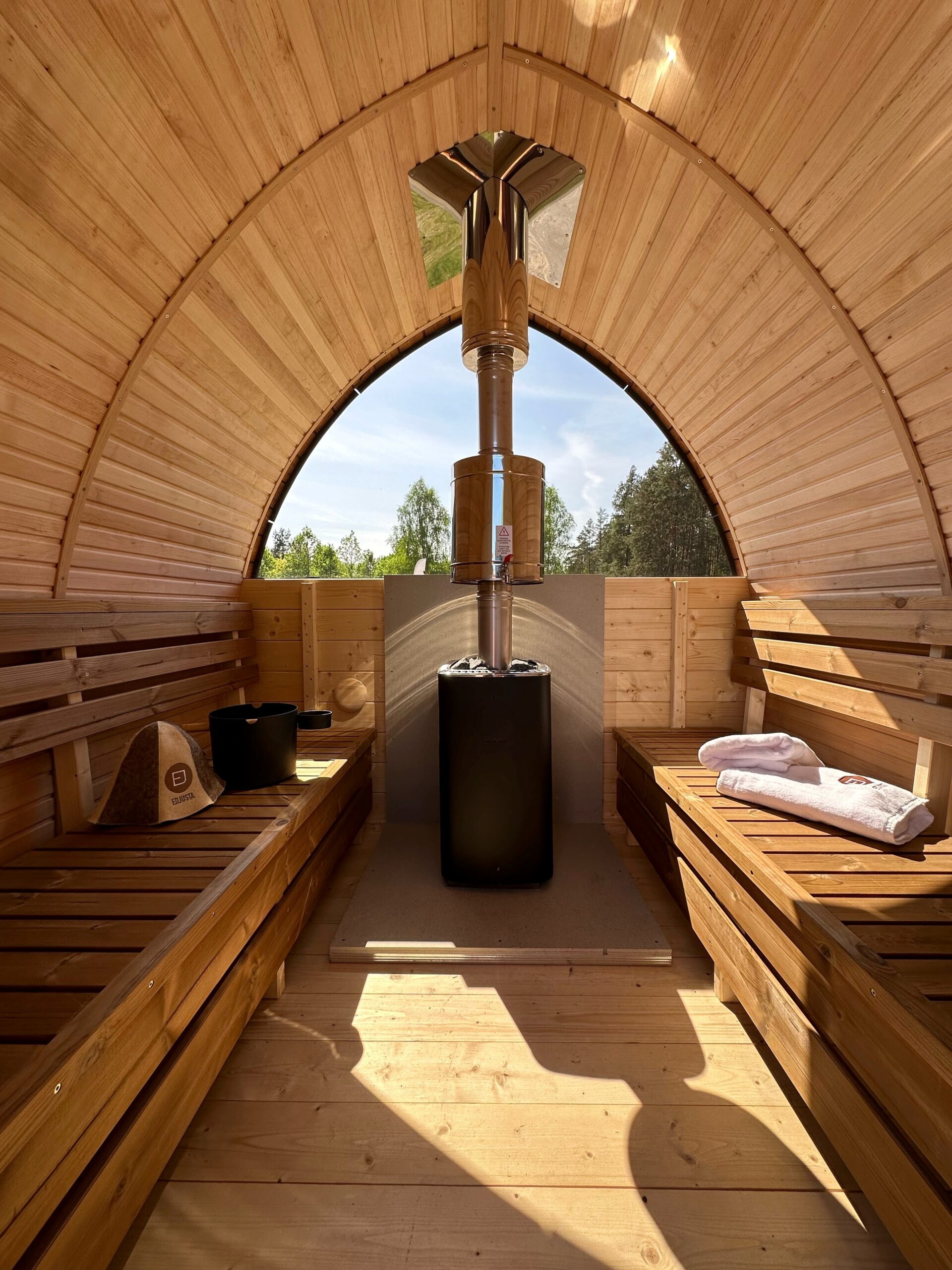 Unsere Iglu-Sauna besticht durch seine harmonische Form und erstklassige Materialien. Gefertigt aus massivem Fichten- oder Thermoholz, überzeugt es mit Langlebigkeit und natürlicher Ästhetik. Die 42 mm starken Wände sorgen für eine optimale Wärmeisolierung, während die rostfreien Spannbänder aus Edelstahl für zusätzliche Stabilität garantieren.