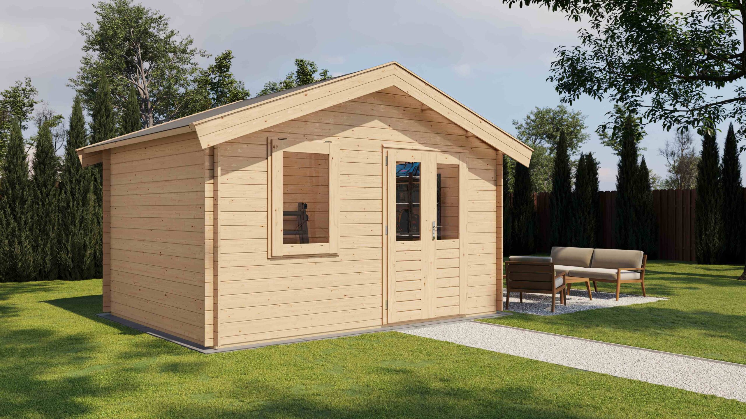 Blockhaus 400x300cm – 28mm erstklassiges getocknetes Fichtenholz – 18mm Dachschallung mit Feder und Nut- Doppelverglasung – Doppeltür und Ausstellfenster mit laminiertem 4,5cm dickem Holz – komplett mit Beschlägen und Befestigungsmaterial