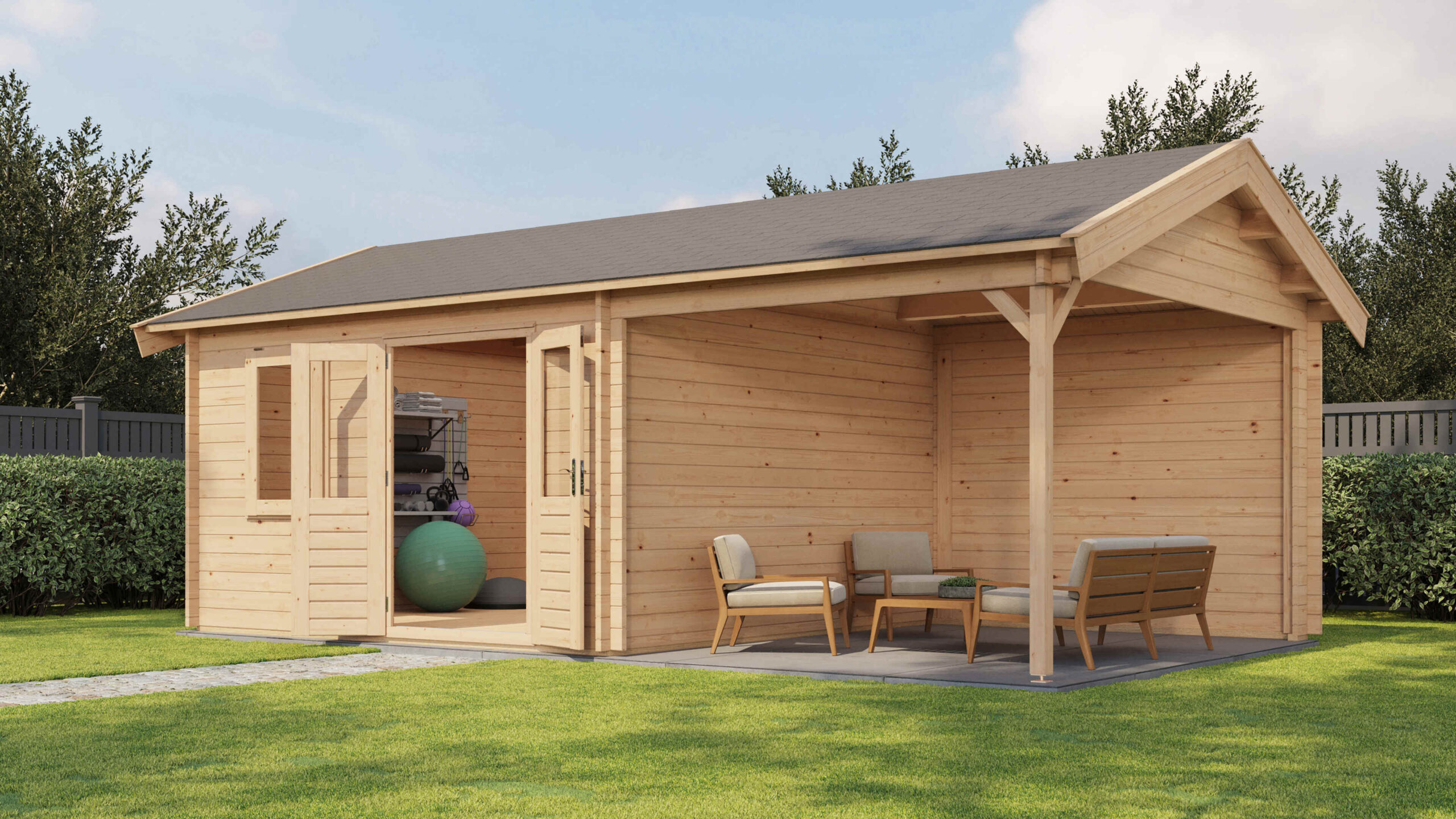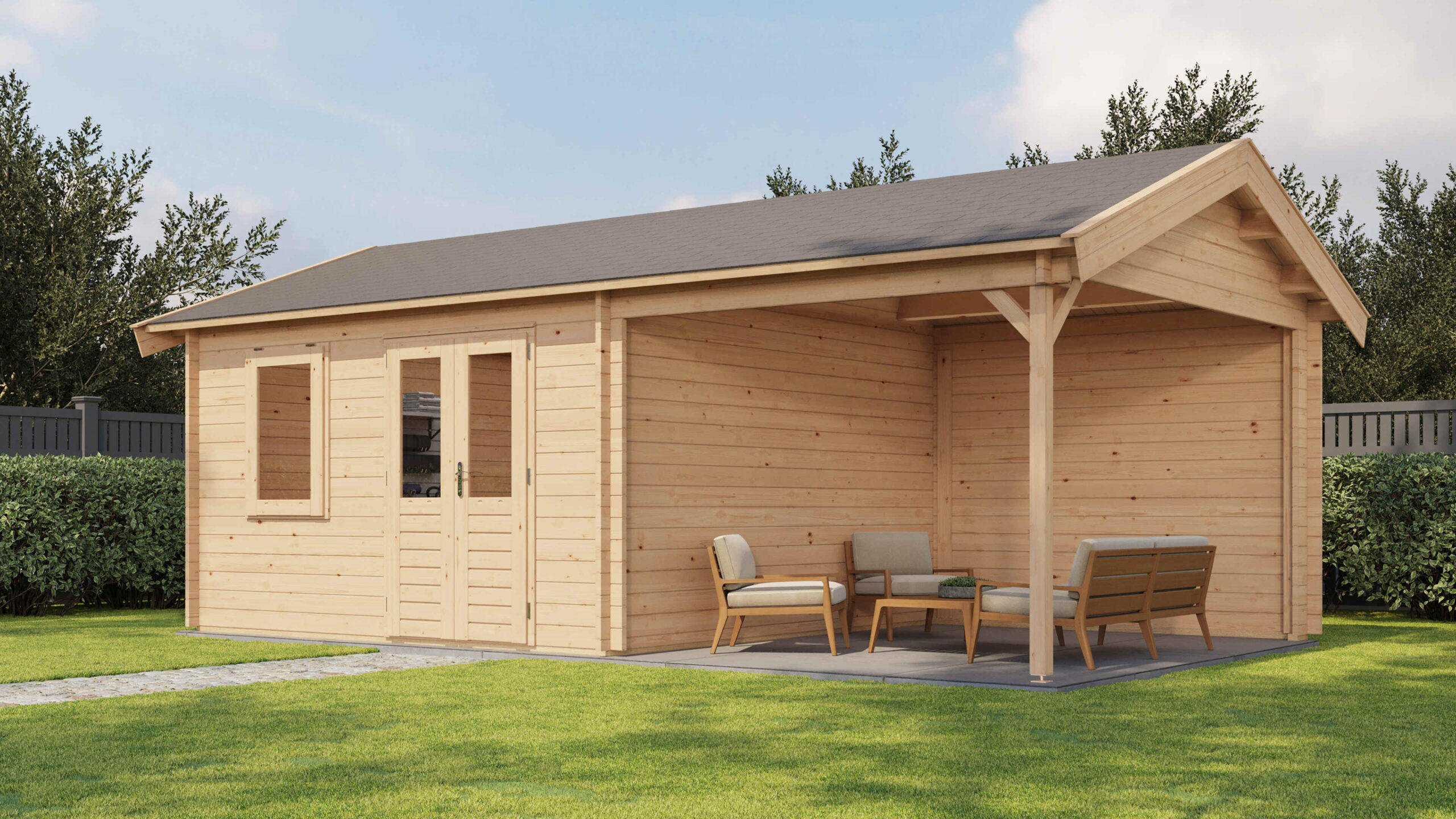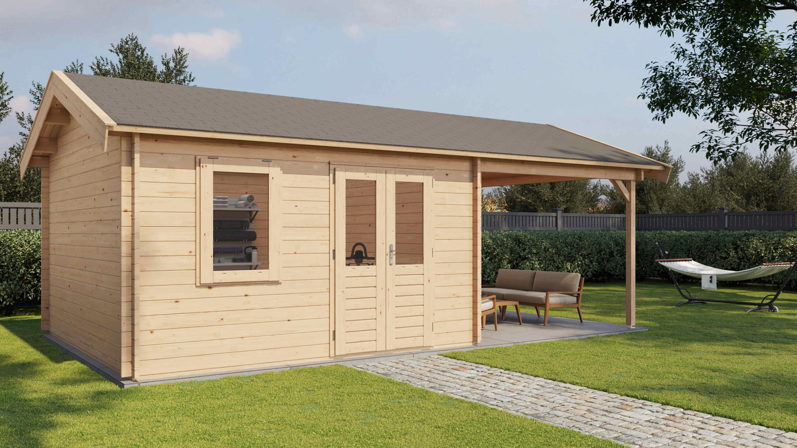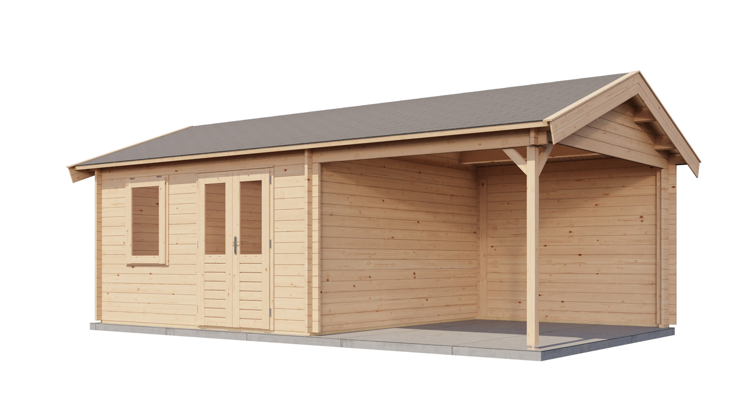 Blockhaus mit Vordach 400x400cm + 300cm – 44mm erstklassiges getocknetes Fichtenholz – 18mm Dachschallung mit Feder und Nut- Doppelverglasung – Doppeltür und Ausstellfenster mit laminiertem 4,5cm dickem Holz – komplett mit Beschlägen und Befestigungsmaterial