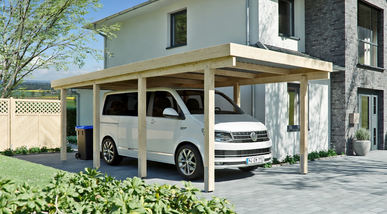 Das Herzstück des Carports bilden die massiven Vollholz-Pfosten (14 x 14 cm), die für eine außergewöhnliche Stabilität sorgen. Alle Beschläge sind vollständig verzinkt und damit optimal gegen Korrosion geschützt. Die extra großen Pfostenabstände ermöglichen ein barrierefreies Öffnen der Autotüren – ein echter Komfortvorteil im Alltag.