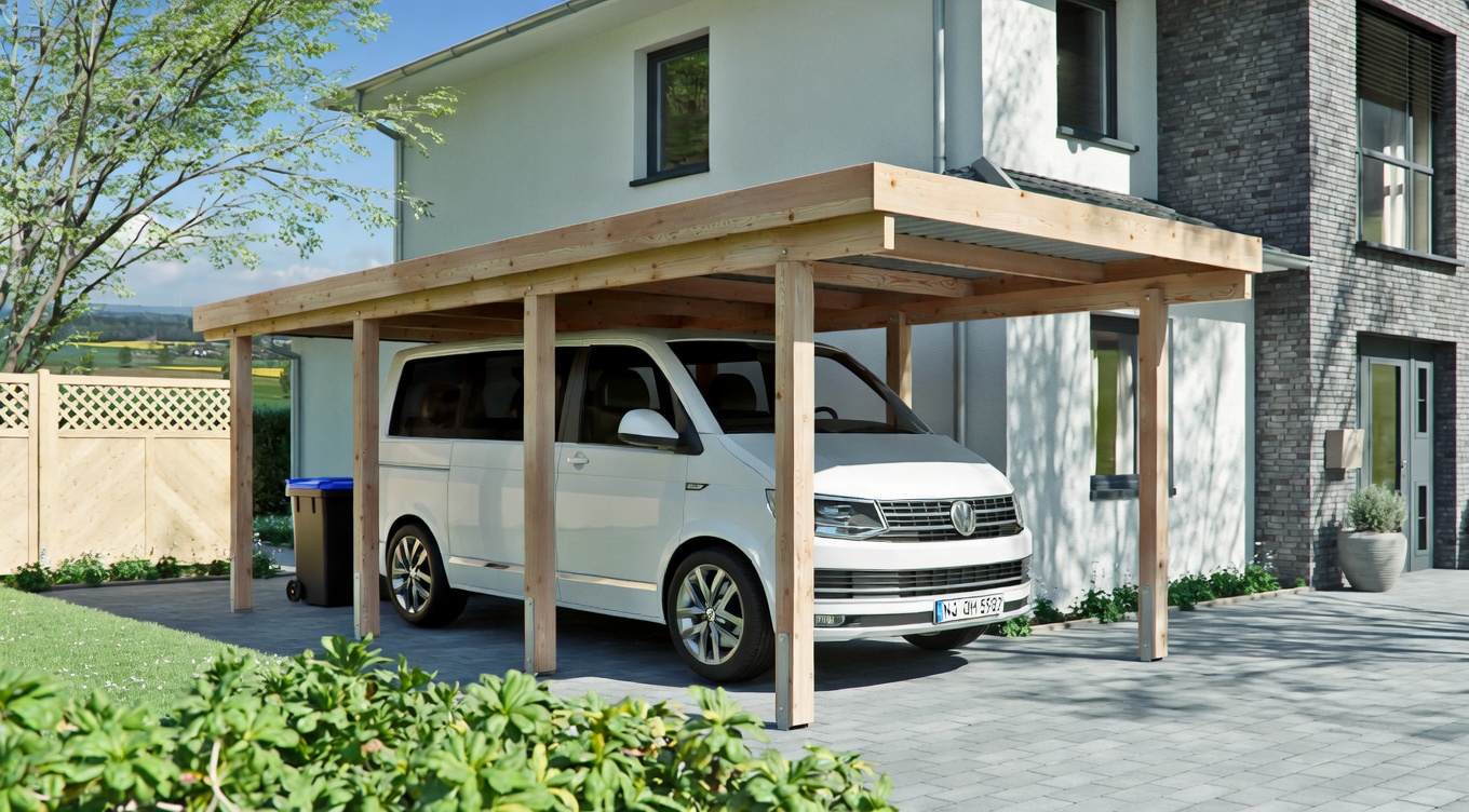Das Herzstück des Carports bilden die massiven Vollholz-Pfosten (14 x 14 cm), die für eine außergewöhnliche Stabilität sorgen. Alle Beschläge sind vollständig verzinkt und damit optimal gegen Korrosion geschützt. Die extra großen Pfostenabstände ermöglichen ein barrierefreies Öffnen der Autotüren – ein echter Komfortvorteil im Alltag.