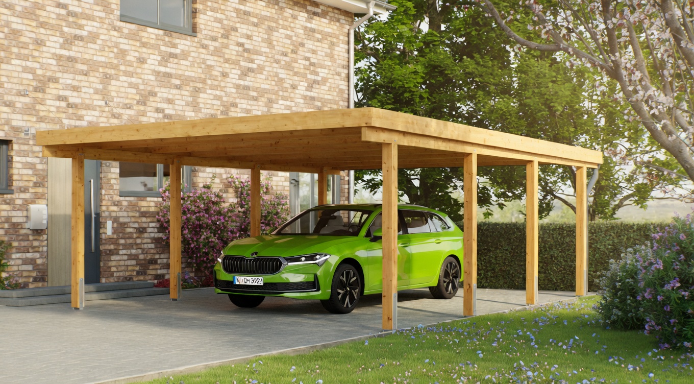 Das Herzstück des Carports bilden die massiven Vollholz-Pfosten (14 x 14 cm), die für eine außergewöhnliche Stabilität sorgen. Alle Beschläge sind vollständig verzinkt und damit optimal gegen Korrosion geschützt. Die extra großen Pfostenabstände ermöglichen ein barrierefreies Öffnen der Autotüren – ein echter Komfortvorteil im Alltag.