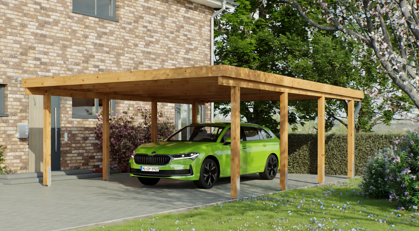 Das Herzstück des Carports bilden die massiven Vollholz-Pfosten (14 x 14 cm), die für eine außergewöhnliche Stabilität sorgen. Alle Beschläge sind vollständig verzinkt und damit optimal gegen Korrosion geschützt. Die extra großen Pfostenabstände ermöglichen ein barrierefreies Öffnen der Autotüren – ein echter Komfortvorteil im Alltag.