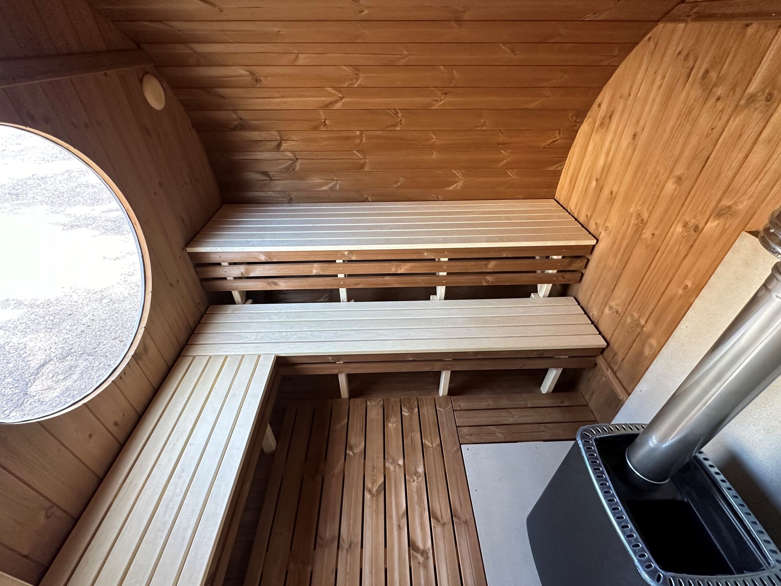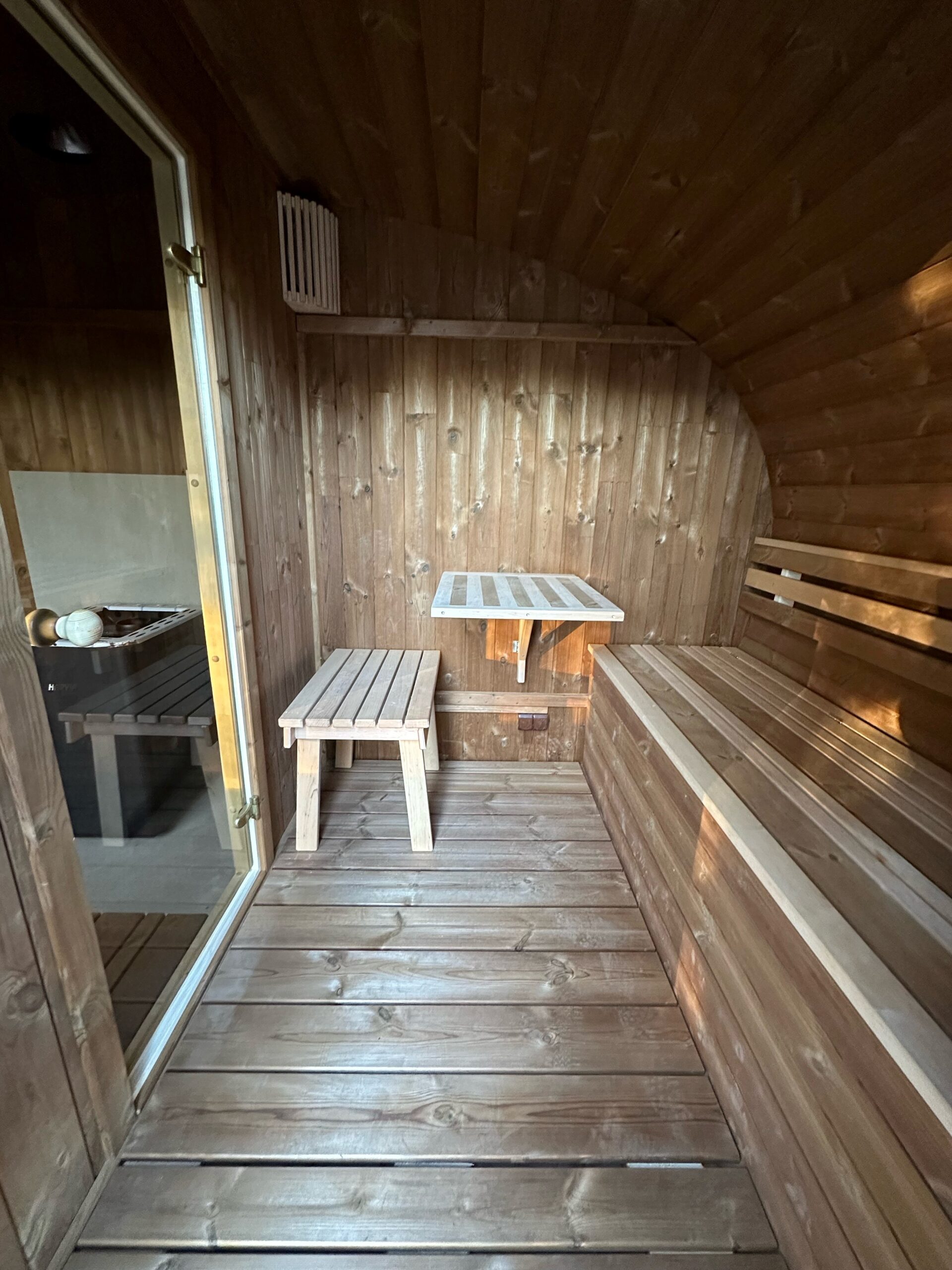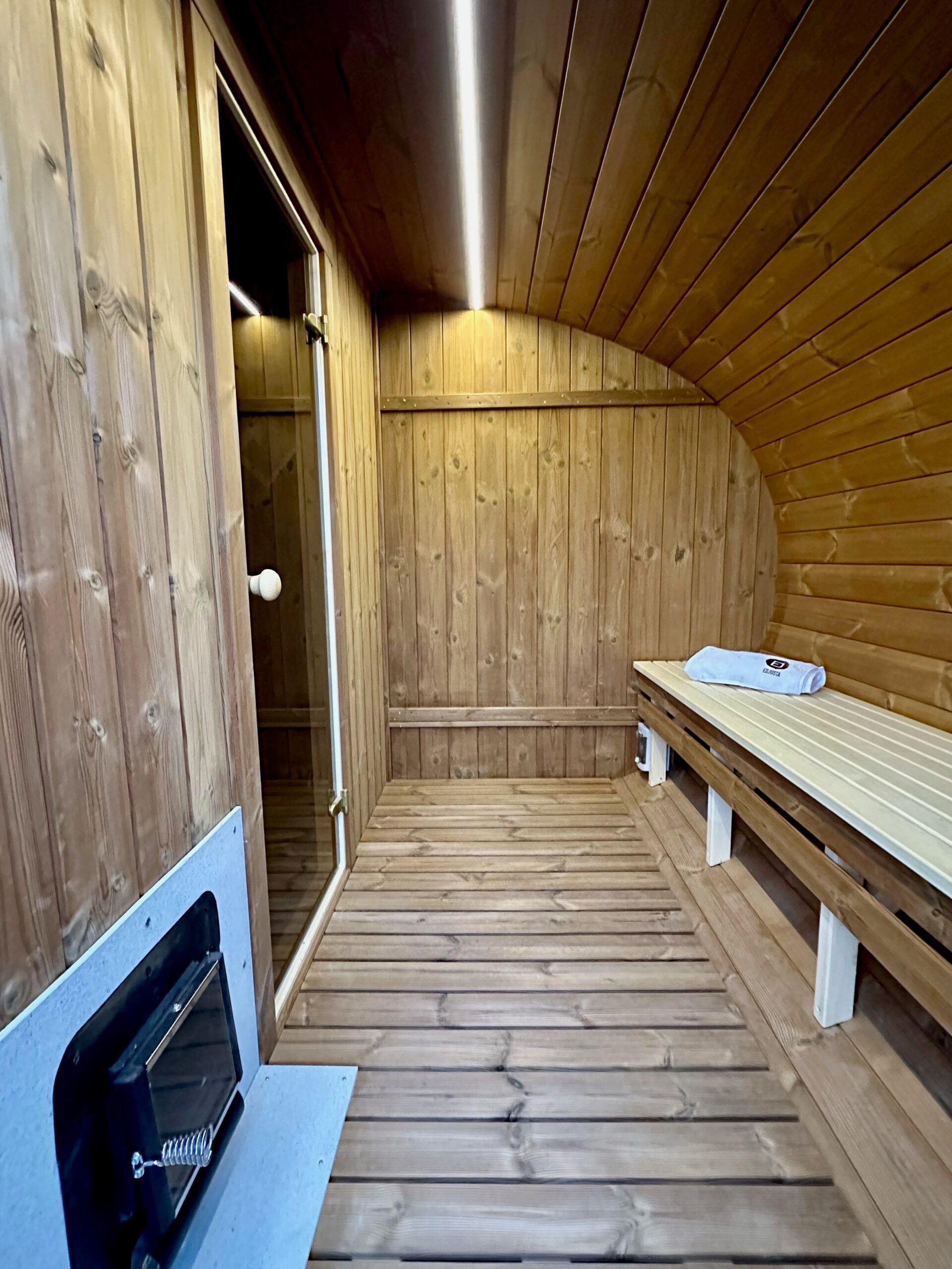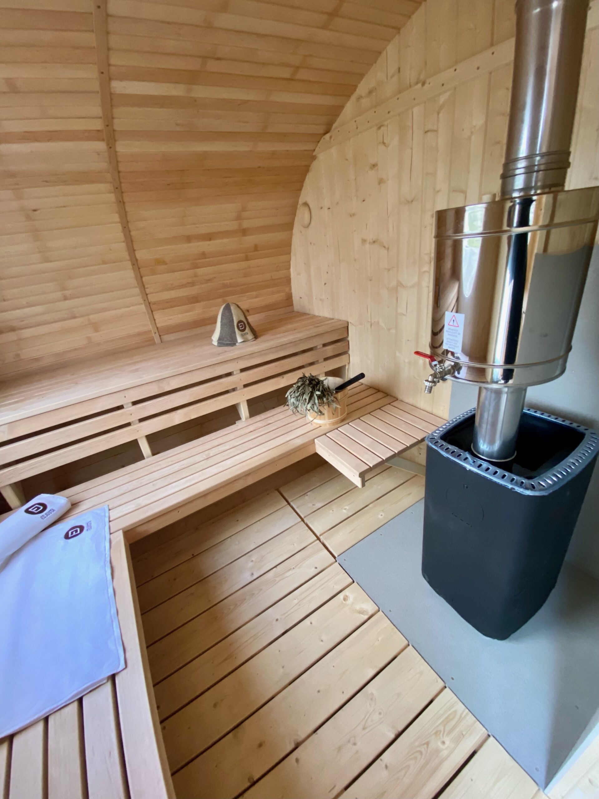 Dies ist ein völlig neues Modell, bei dem die Breite der Sauna erweitert wurde. Optisch ist sie völlig anders und hebt sich sofort von den Standard-Saunen ab. Die ovale Sauna kann als zusätzliche Option mit einer großen Außenterrasse ausgestattet werden.