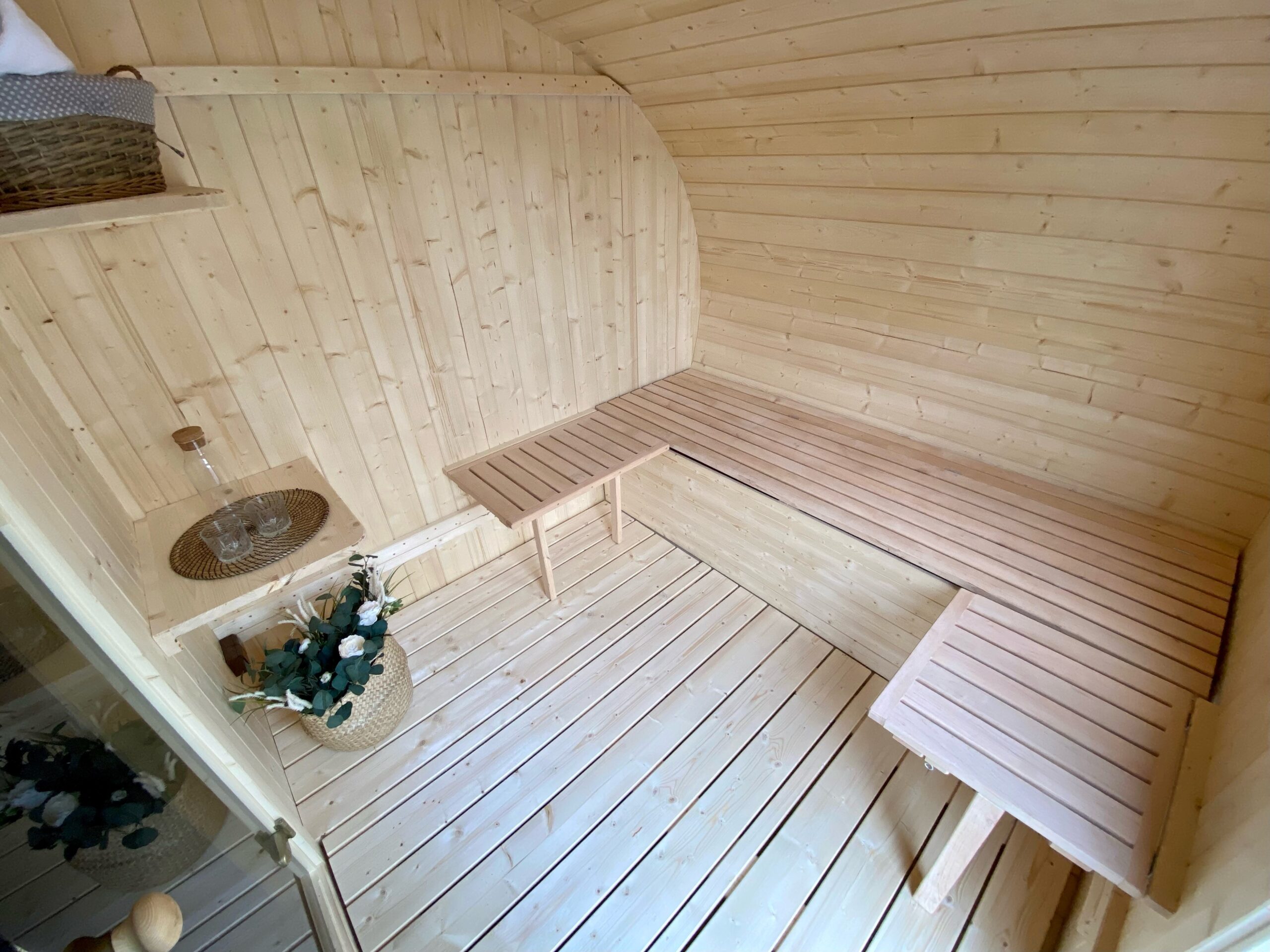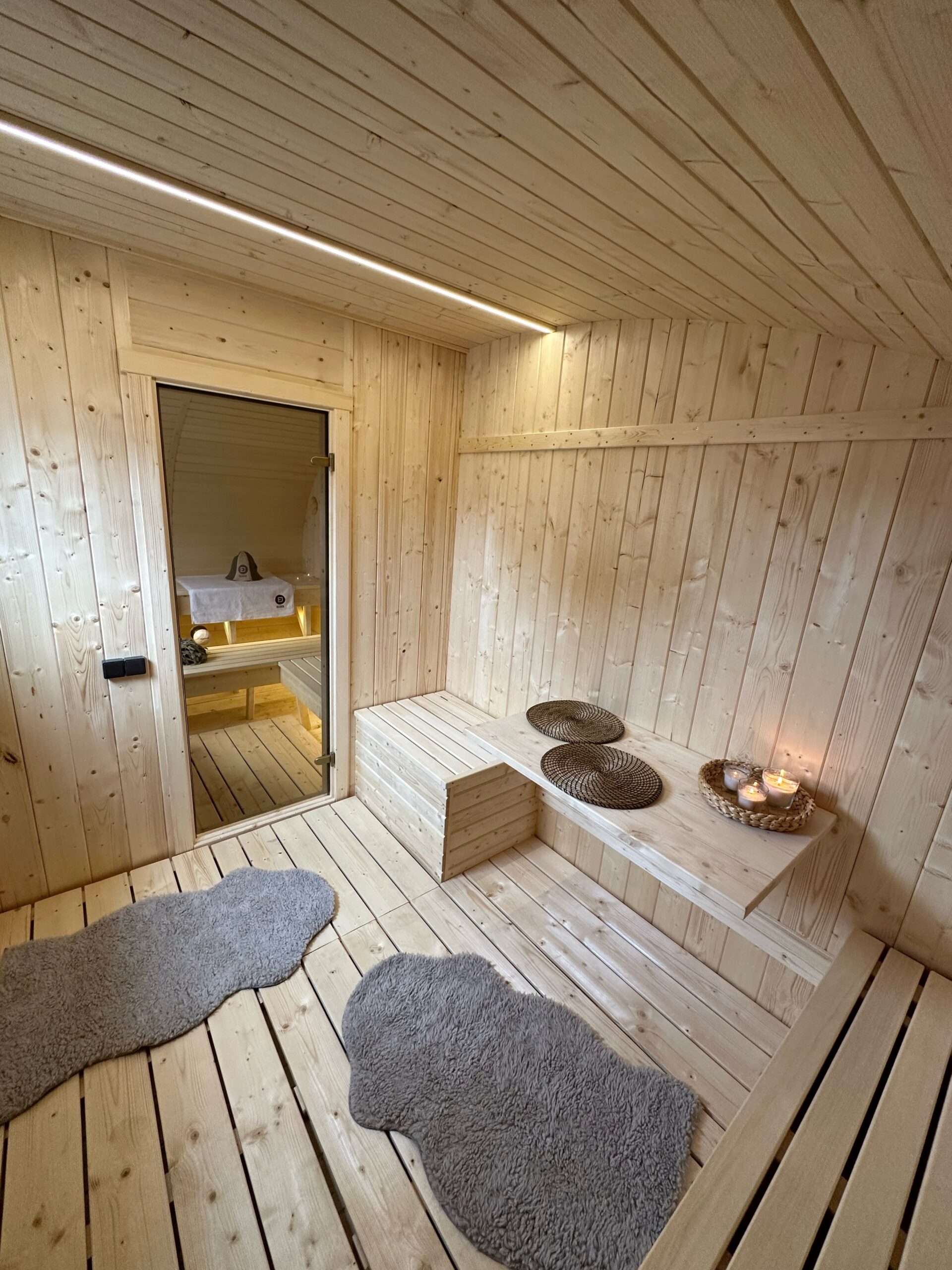 Die Elipsen-Sauna Orbis kann mit oder ohne Vorraum konfiguriert werden, sodass sie sich perfekt in Ihre Räumlichkeiten einfügt. Zusätzlich bieten wir vielfältige Upgrades, um Ihren persönlichen Wellness-Traum zu verwirklichen: