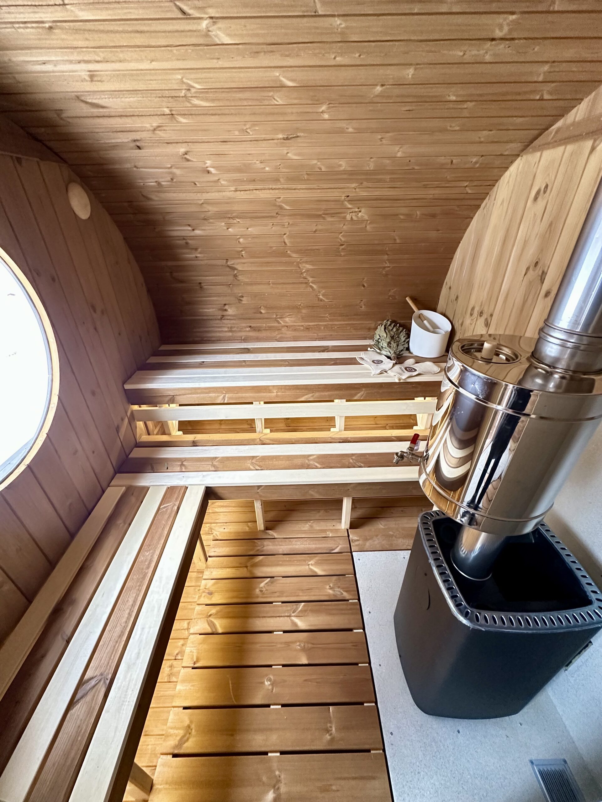 - Großes Rundfenster (Ø 90 cm) – schafft eine helle, einladende Atmosphäre