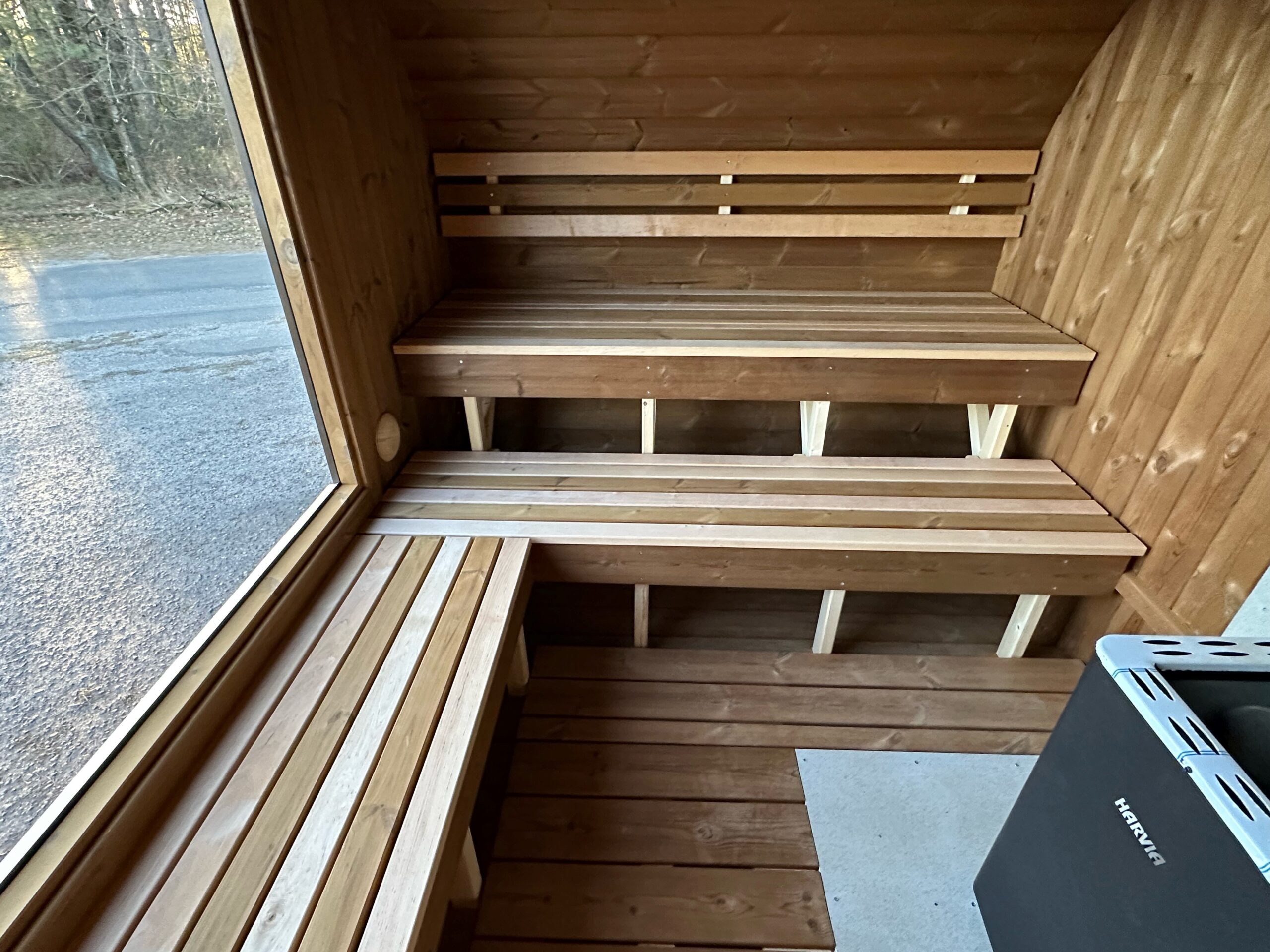 - Ergonomische Sitzbänke – einstufig rechts, zweistufig links aus Schwarzerle, Espe oder Thermoholz