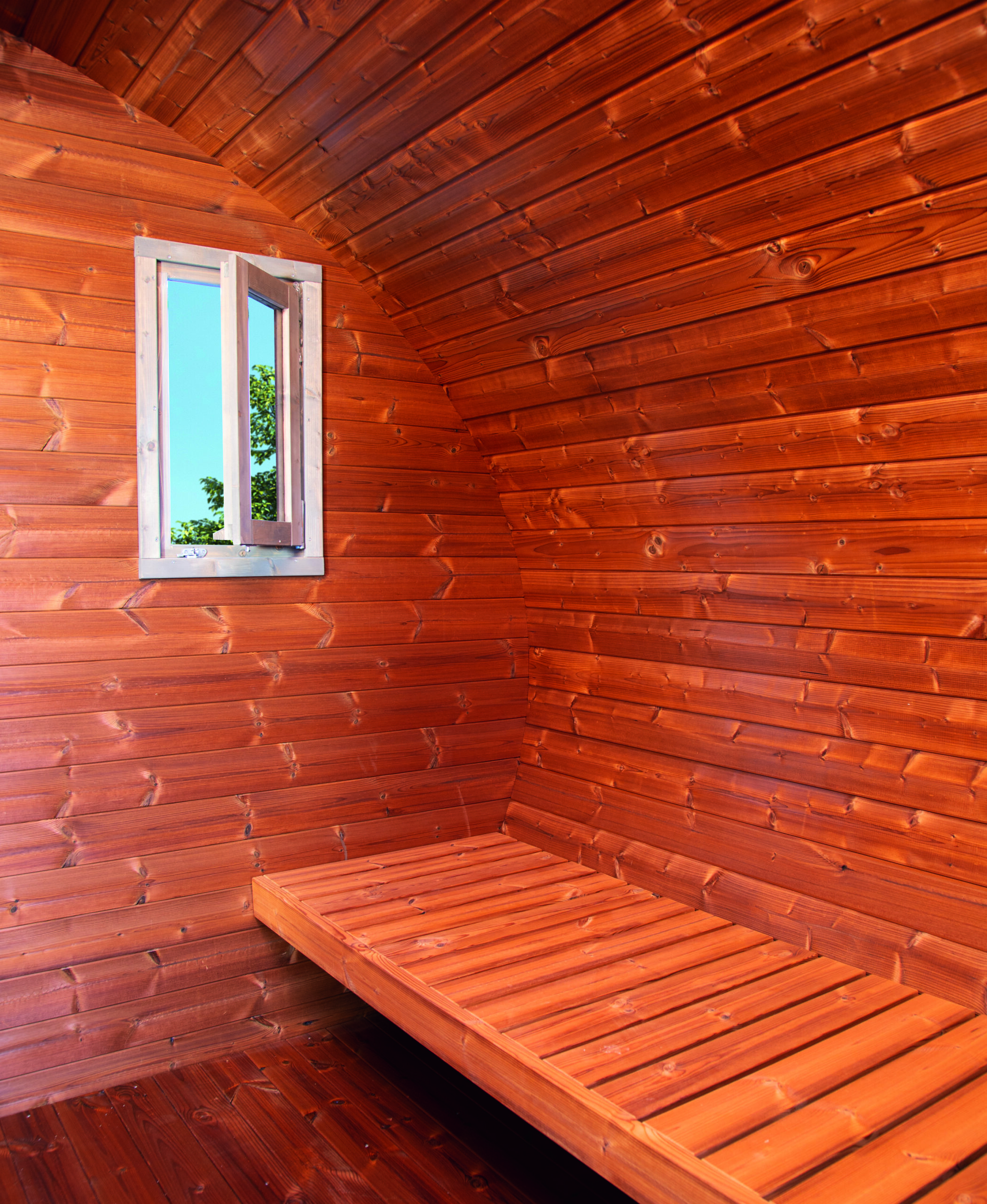 Das Saunahaus verfügt über eine Einzeltür außen (59 x 178 cm) und eine Einzeltür innen (69 x 189 cm), die einen einfachen Zugang ermöglichen. Zwei Fenster (ein feststehendes und ein 2-Hand Dreh-/Kipp-Fenster) sorgen für eine angenehme Belüftung und helle Räumlichkeiten.