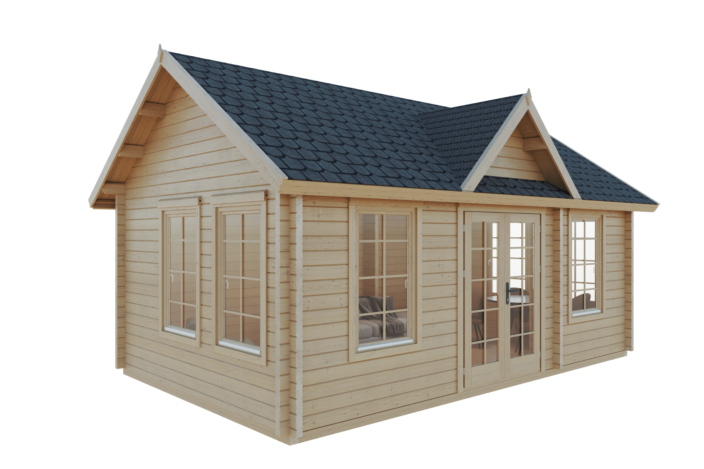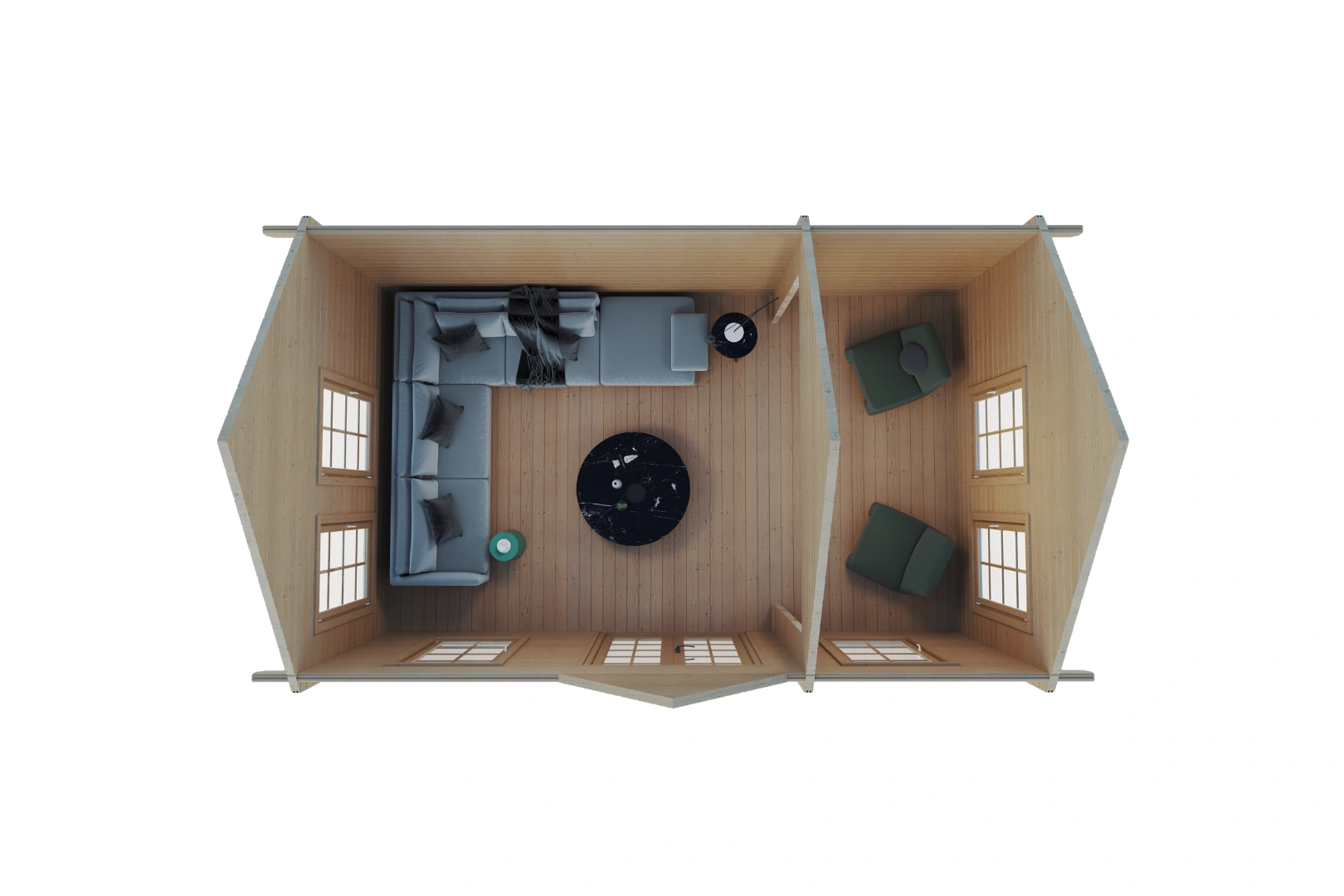 Die spektakuläre Fensterkonfiguration umfasst sechs großzügige Fenster im Format 900 x 1435 mm – jedes dieser bodentiefen Elemente sorgt für maximale Helligkeit und schafft eine einzigartige Verbindung zwischen Innenraum und umgebender Natur. Die gehärtete Doppelverglasung garantiert Langlebigkeit und Sicherheit auf höchstem Niveau.