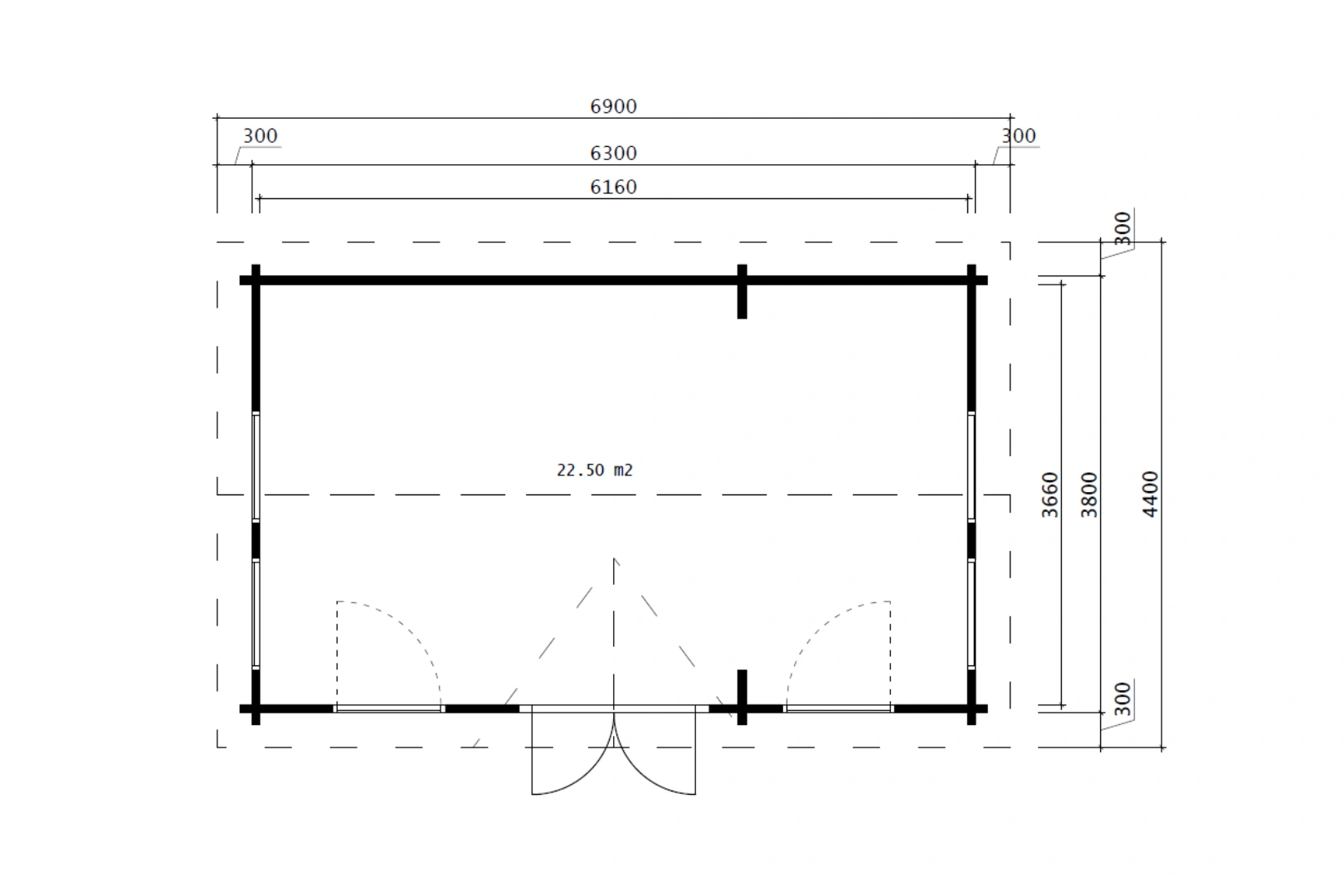 Mit Außenwandmaßen von 380 x 630 cm bietet das Ferienhaus Arrow eine Grundfläche von 22,5 m², die sich in einen einzigen, großzügigen Raum gliedert. Dieses offene Raumkonzept bietet maximale Freiheit bei der Gestaltung: