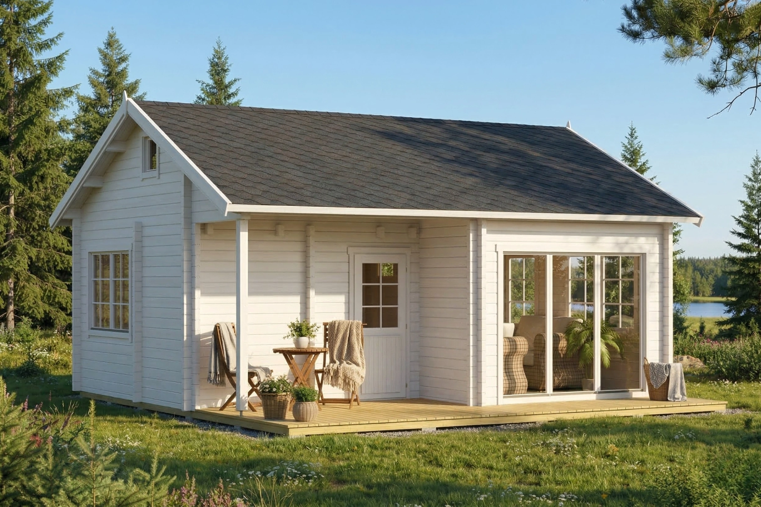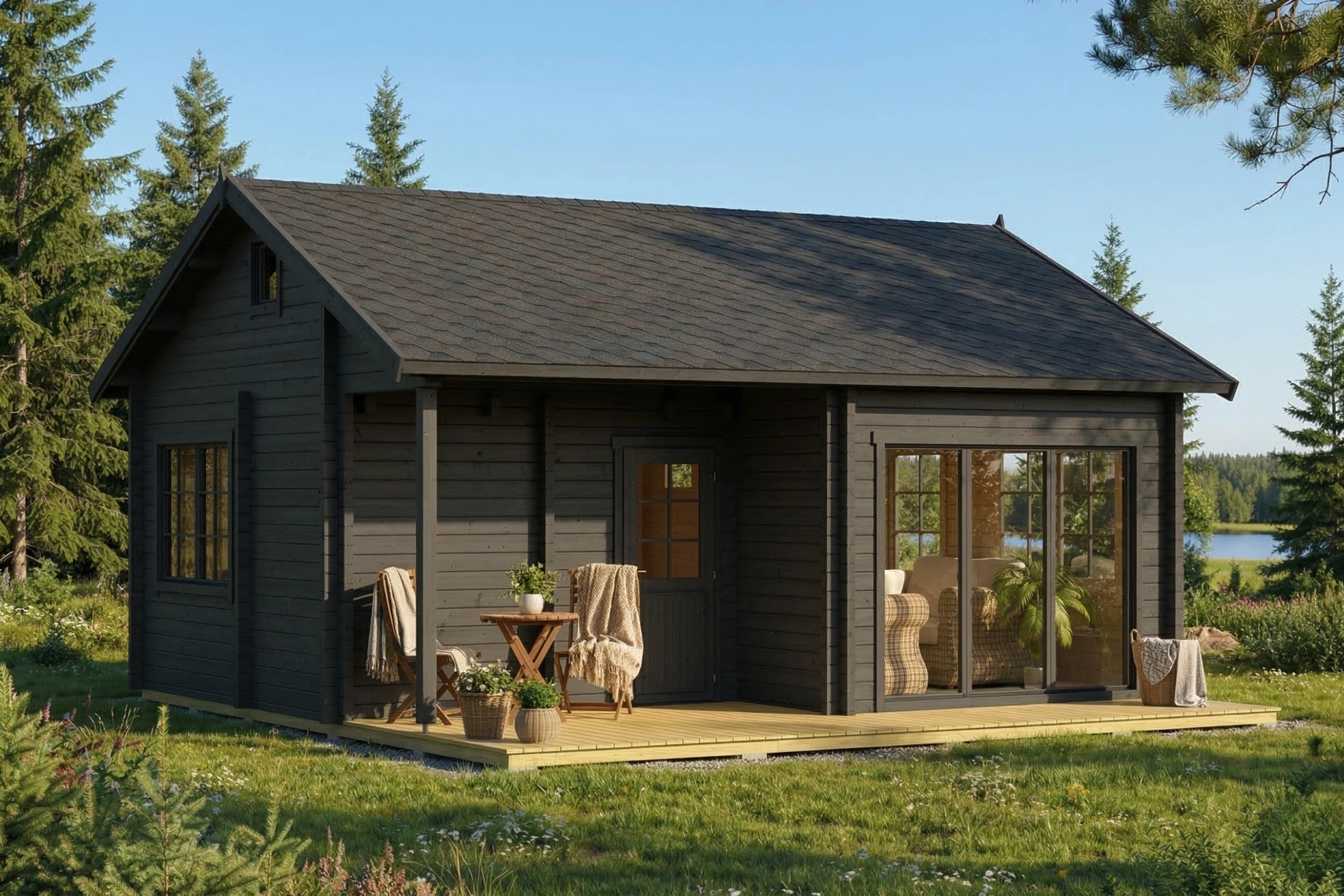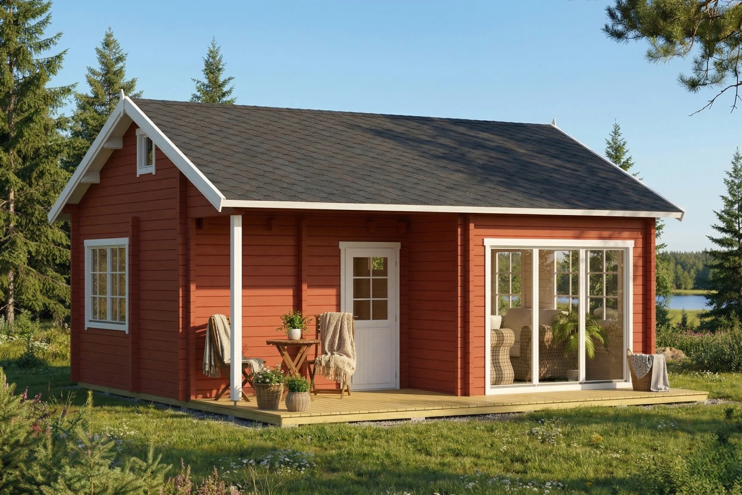 Die Basis des Ferienhauses Dixie bildet hochwertiges nordisches Holz, das für seine außergewöhnliche Dichte, seine helle Farbgebung und seine natürlichen Dämmeigenschaften geschätzt wird. Dieses langsam gewachsene Nadelholz aus den kühlen Wäldern Skandinaviens sorgt für ein gesundes Raumklima, indem es Feuchtigkeit reguliert und Schadstoffe aus der Luft filtert.