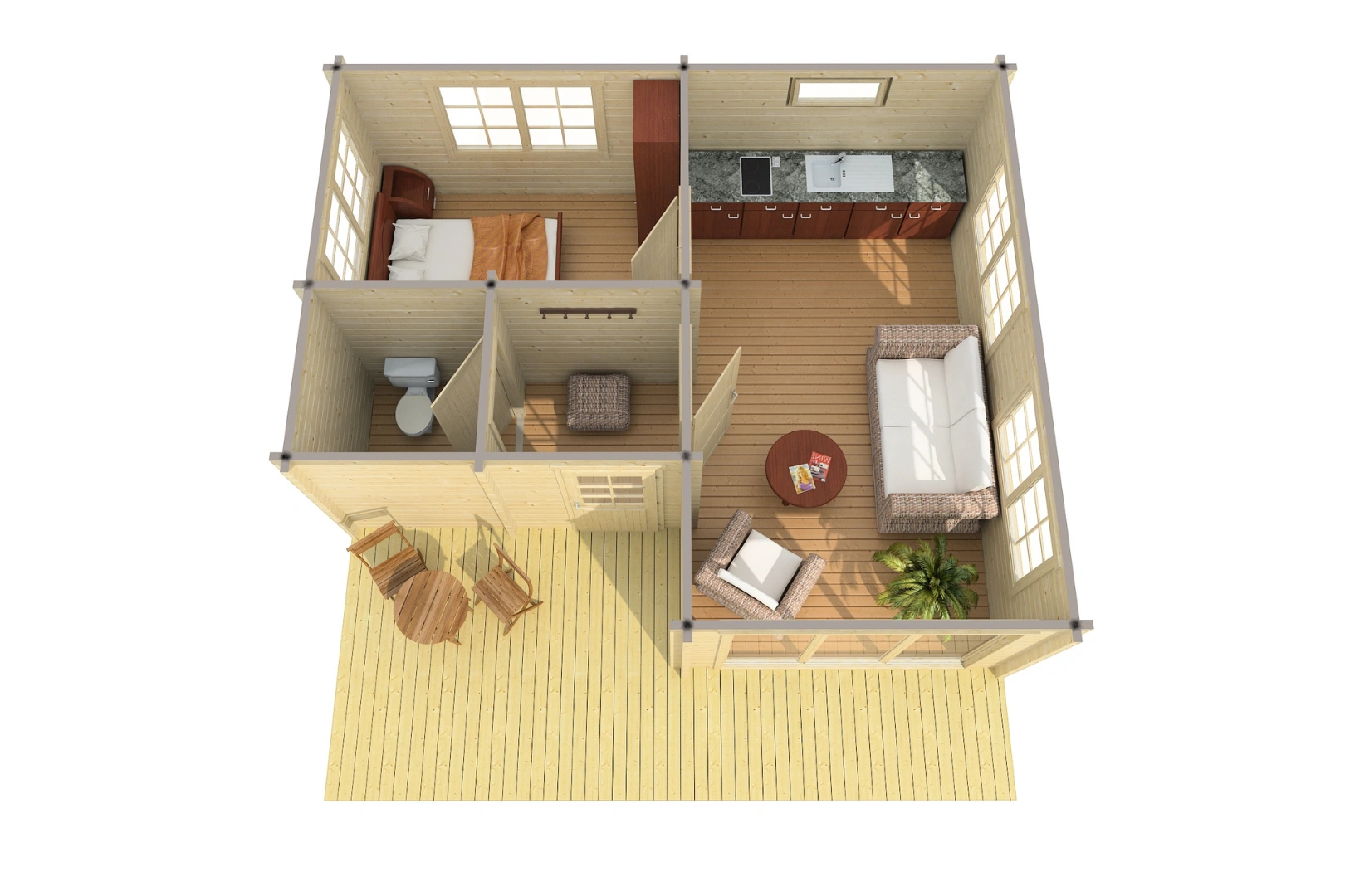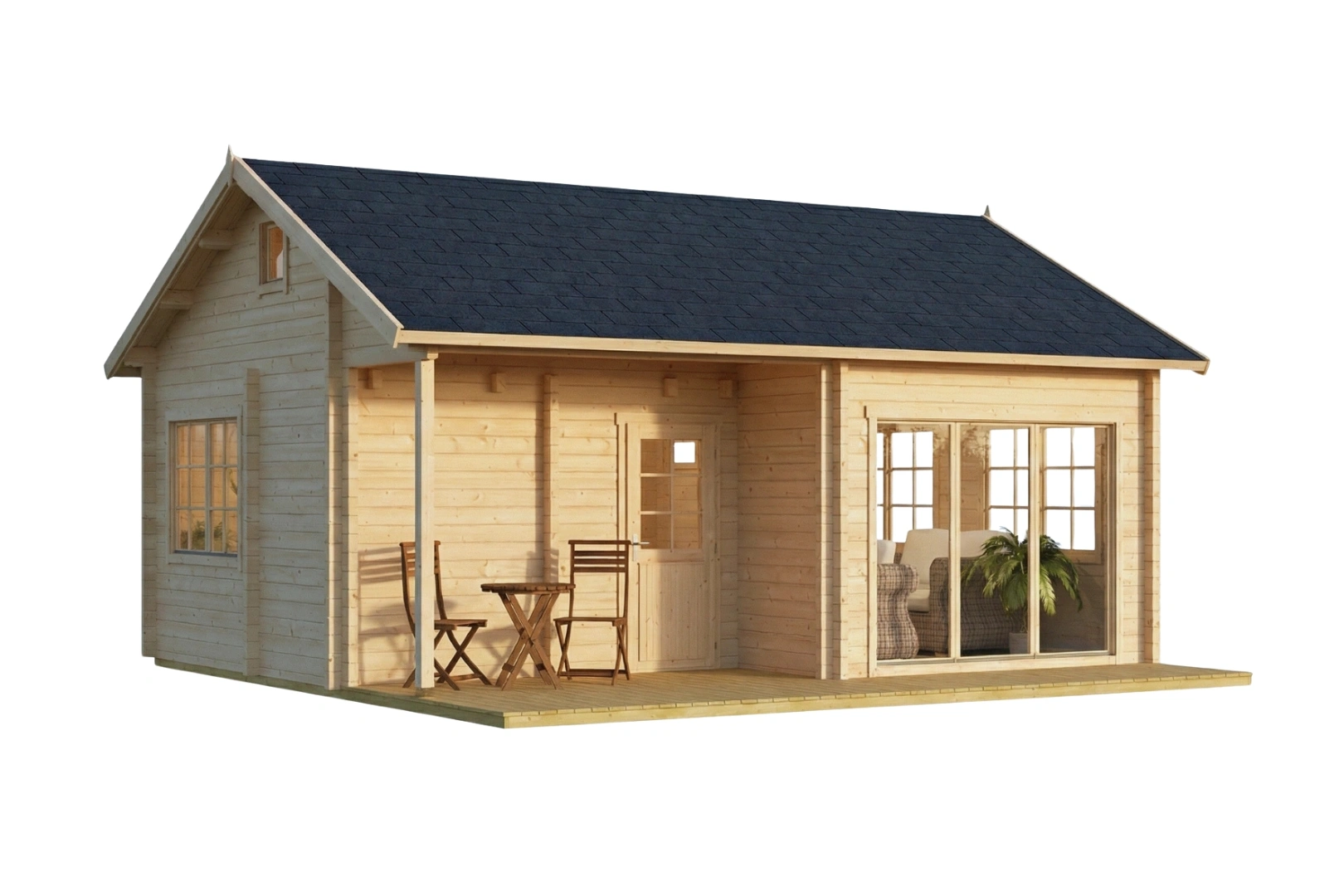 - Massive Blockwände: 70 mm starke Bohlen mit Doppelzahn-Nut-System für optimale Stabilität und Dämmung.