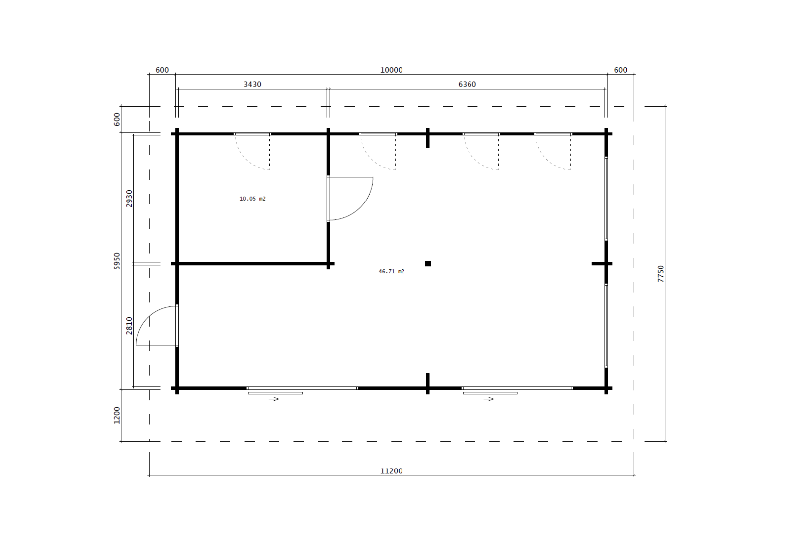 - Traufhöhen: 1200 / 600 / 600 / 600 mm – asymmetrisches, architektonisch anspruchsvolles Design mit einer besonders hohen Traufe von 1,20 Metern