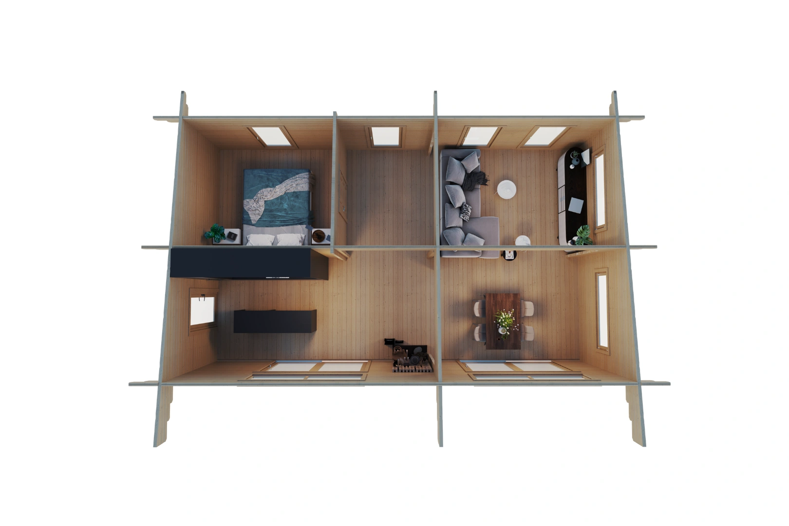 Mit Außenwandmaßen von 1000 x 595 cm bietet das Ferienhaus Lindi eine beeindruckende Grundfläche von 56,8 m². Die Raumaufteilung lässt sich flexibel gestalten und bietet Platz für verschiedene Wohnkonzepte – ob als offener Wohnbereich mit integrierter Küche oder mit separaten Zimmern für mehr Privatsphäre.