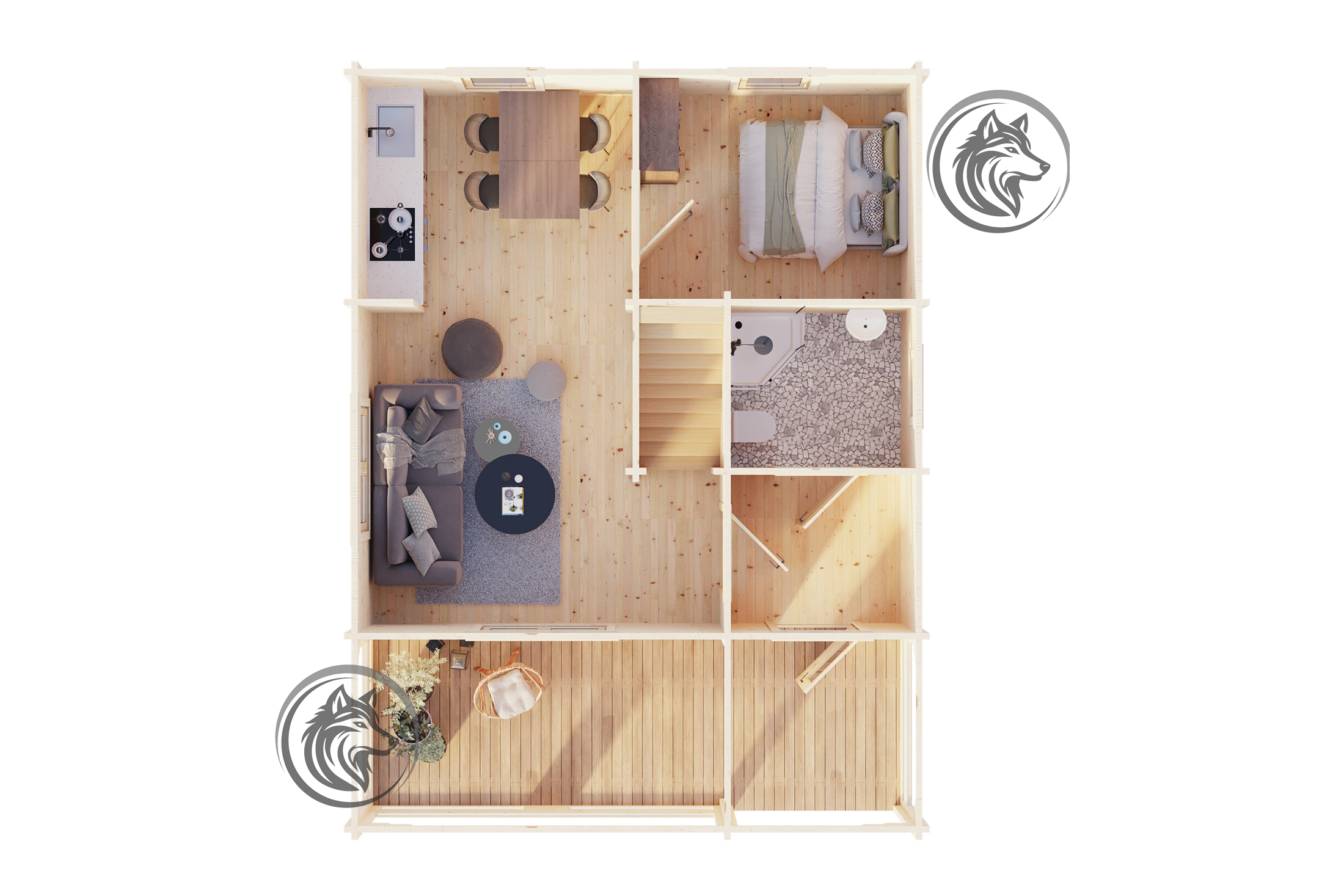 Mit seinen beeindruckenden Abmessungen von 6,36 x 8,46 Metern (Breite x Länge) bietet das Ferienhaus Oka auf einer großzügigen Grundfläche von rund 54 m² ausreichend Platz für alle. Ob für die ausgedehnte Familie, einen Freundeskreis oder als dauerhafter, komfortabler Wohnsitz – hier findet jeder sein Lieblingsplätzchen. Die Wandhöhe von 2,70 Meter schafft ein behagliches und gleichzeitig offenes Raumgefühl, das zum Verweilen und Entspannen einlädt. Die massive Wandstärke von 68 mm bildet das Fundament dieses Wohlgefühls. Das naturbelassene Holz reguliert auf natürliche Weise das Raumklima, speichert Wärme und sorgt so für ein angenehm frisches Ambiente im Sommer und eine wohlige Wärme in der kühleren Jahreszeit.
