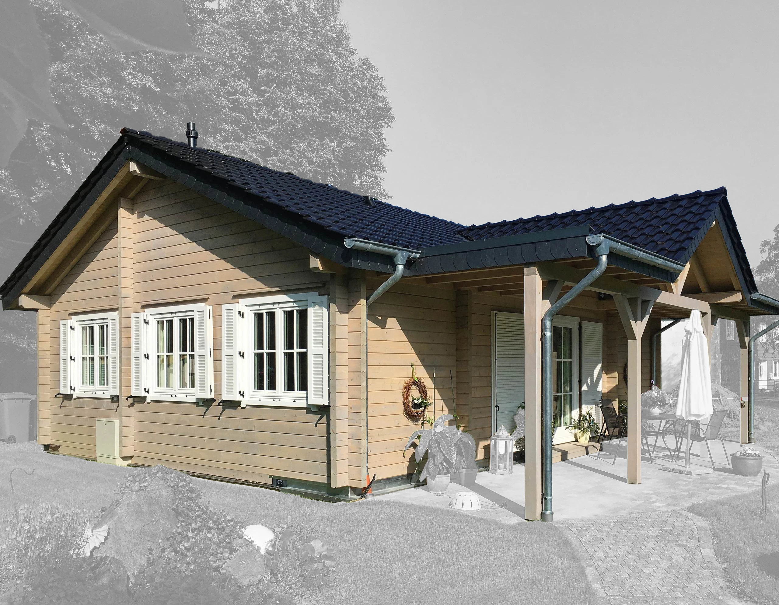 - Klassisches Satteldach mit einem umlaufenden Dachüberstand von 50 cm, das Schutz vor Witterung bietet