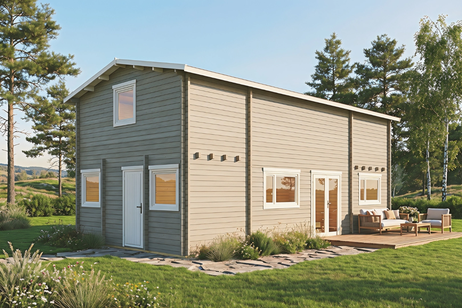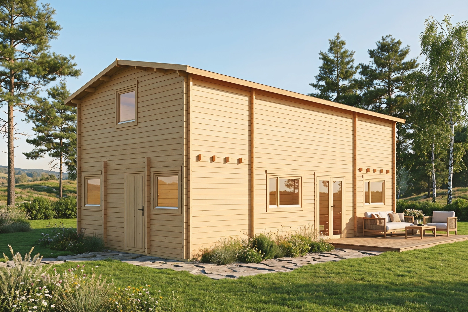 Das Ferienhaus Småland ist ein wahres Raumwunder unter den Blockbohlenhäusern. Mit seiner beeindruckenden Firsthöhe von über 5 Metern, der großzügigen Grundfläche von insgesamt 97,3 m² und der Aufteilung in neun separate Räume setzt dieses Modell völlig neue Maßstäbe für anspruchsvolles Wohnen in Holz. Es verbindet die natürliche Wärme nordischen Holzes mit einer architektonischen Großzügigkeit, die ihresgleichen sucht – ideal für große Familien, Mehrgenerationenhaushalte oder als repräsentatives Feriendomizil für anspruchsvolle Gäste.