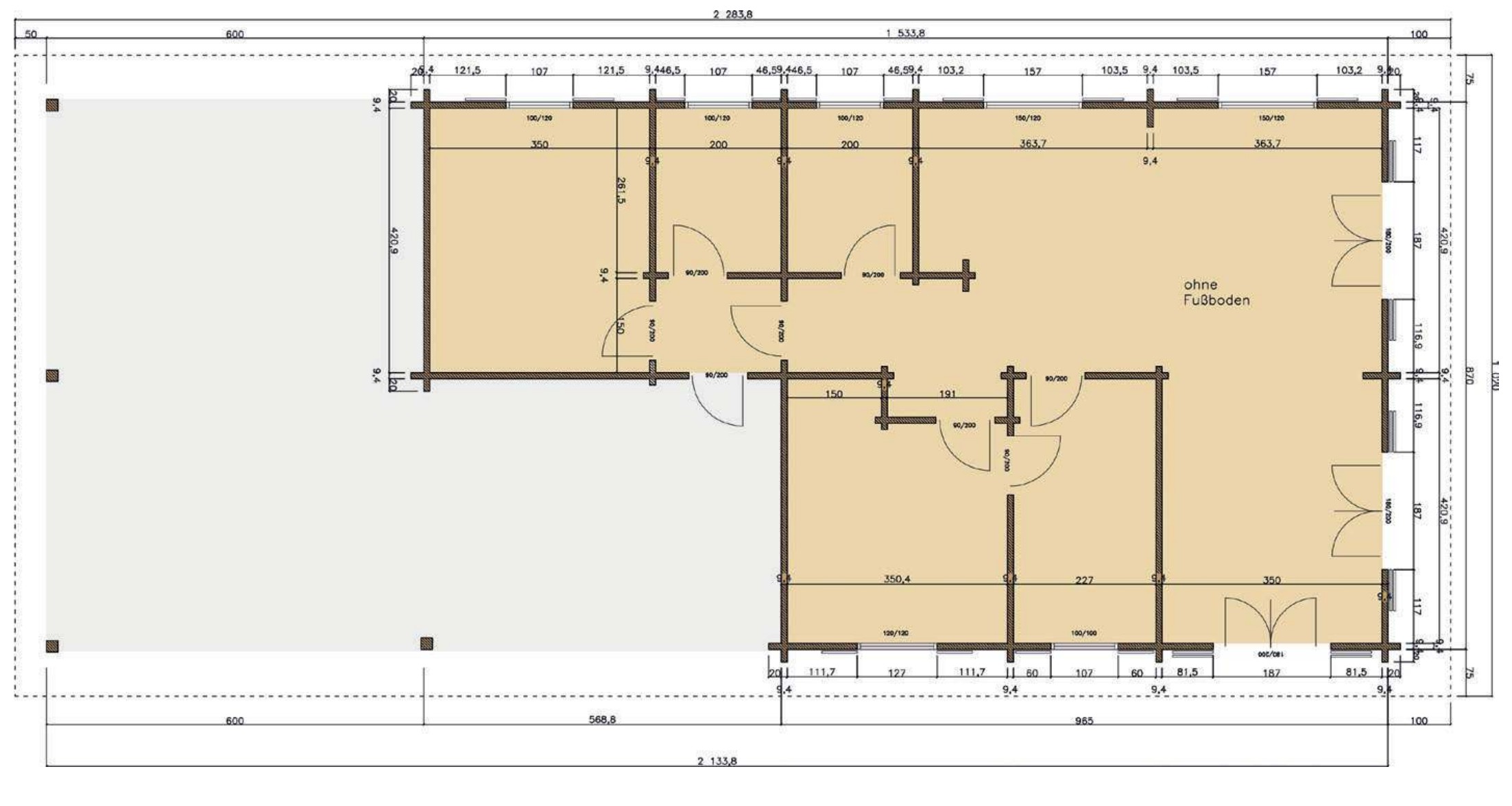 - Dachüberstand: vorne 100 cm, hinten 650 cm, seitlich je 75 cm