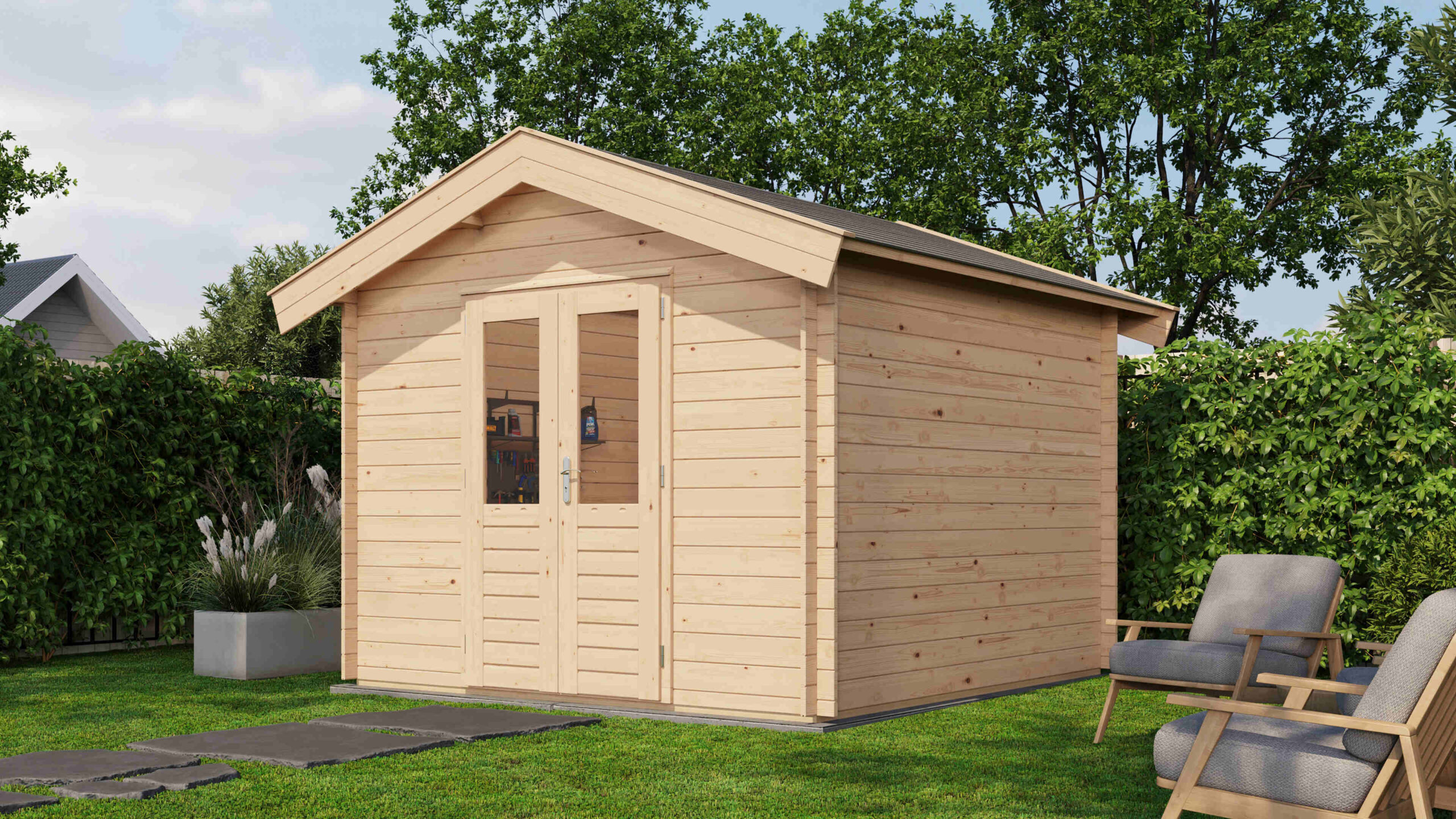 Blockhaus 300x300cm – 28mm erstklassiges getrocknetes Fichtenholz – 18mm Dachschalung mit Feder und Nut- Doppelverglasung – Einzeltür mit laminiertem 4,5cm dickem Holz – komplett mit Beschlägen und Befestigungsmaterial
