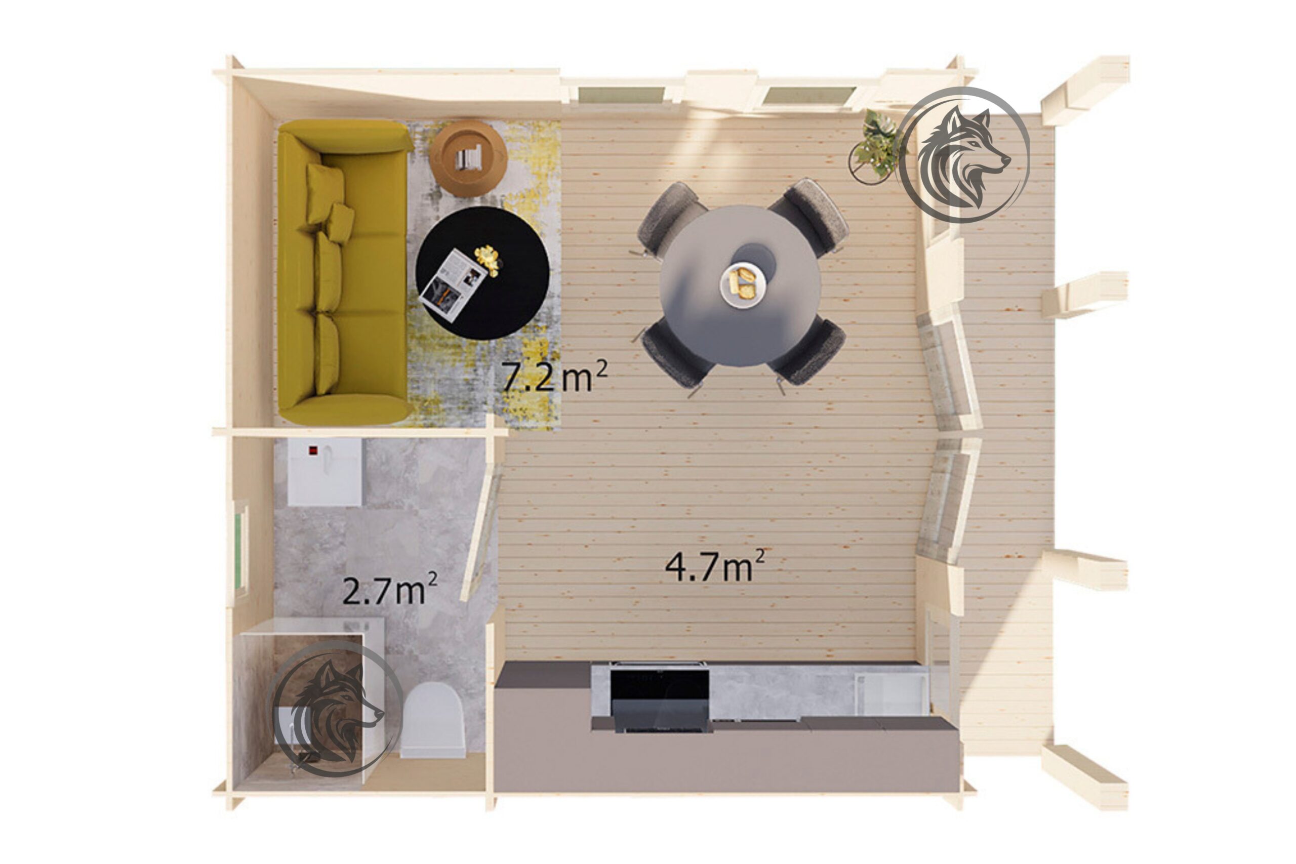 Das Gartenhaus verfügt über eine komfortable Wohnfläche von 15,26 m², die sich ideal für die Einrichtung von Wohn- oder Arbeitsbereichen eignet.