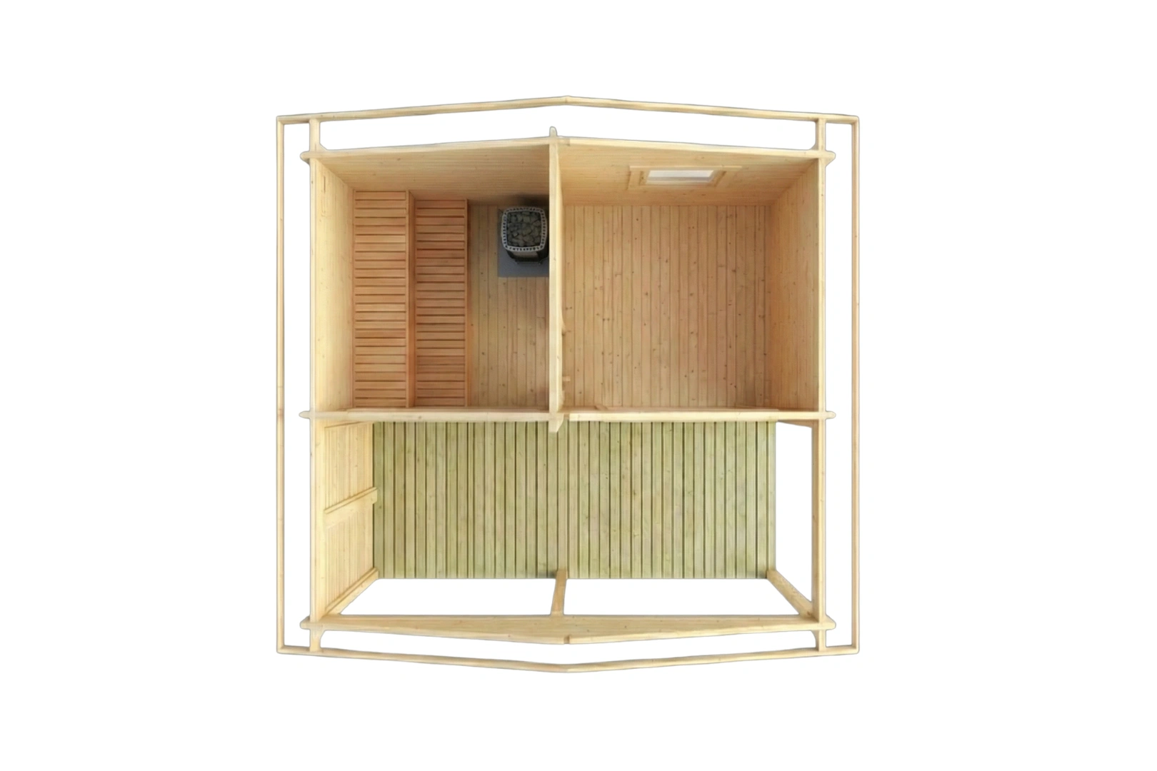 Mit den Außenwandmaßen von 485 x 254 cm und einer Grundfläche von 11,14 m² bietet die Alaska ausreichend Platz für eine durchdachte Zweiraum-Aufteilung. Die großzügige Höhe von 3,0 m (Wandhöhe 2,4 m) schafft ein angenehm offenes Raumgefühl. Die flexible Bauweise erlaubt es zudem, die Sauna gespiegelt aufzustellen, sodass Sie sie optimal an die Gegebenheiten Ihres Gartens und die Himmelsrichtung anpassen können.