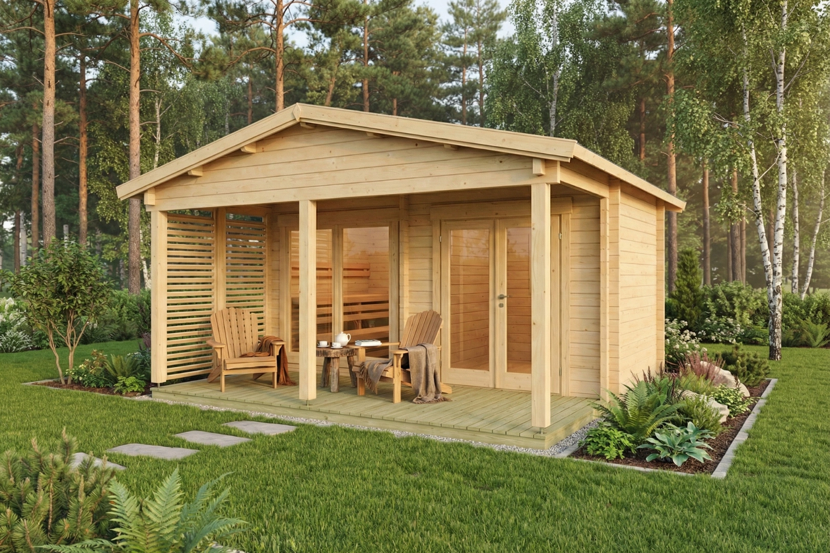 Die Gartensauna Alaska wird als umfangreiches Set geliefert, das weit über die reinen Blockbohlen hinausgeht. Sie erhalten ein komplettes Paket, das bereits ein 2200 mm tiefes Vordach umfasst – den idealen Ort, um nach dem Saunagang an der frischen Luft zu verweilen. Die stabile Konstruktion wird durch den im Lieferumfang enthaltenen 28 mm starken Fußboden, die 18 mm Dachbretter und alle notwendigen Verbindungselemente abgerundet. Die großzügige Terrasse ist ebenfalls im Lieferumfang enthalten und erweitert den nutzbaren Raum ins Freie. So können Sie echte Sauna-Tradition mit erfrischenden Abkühlungen im Freien zelebrieren.