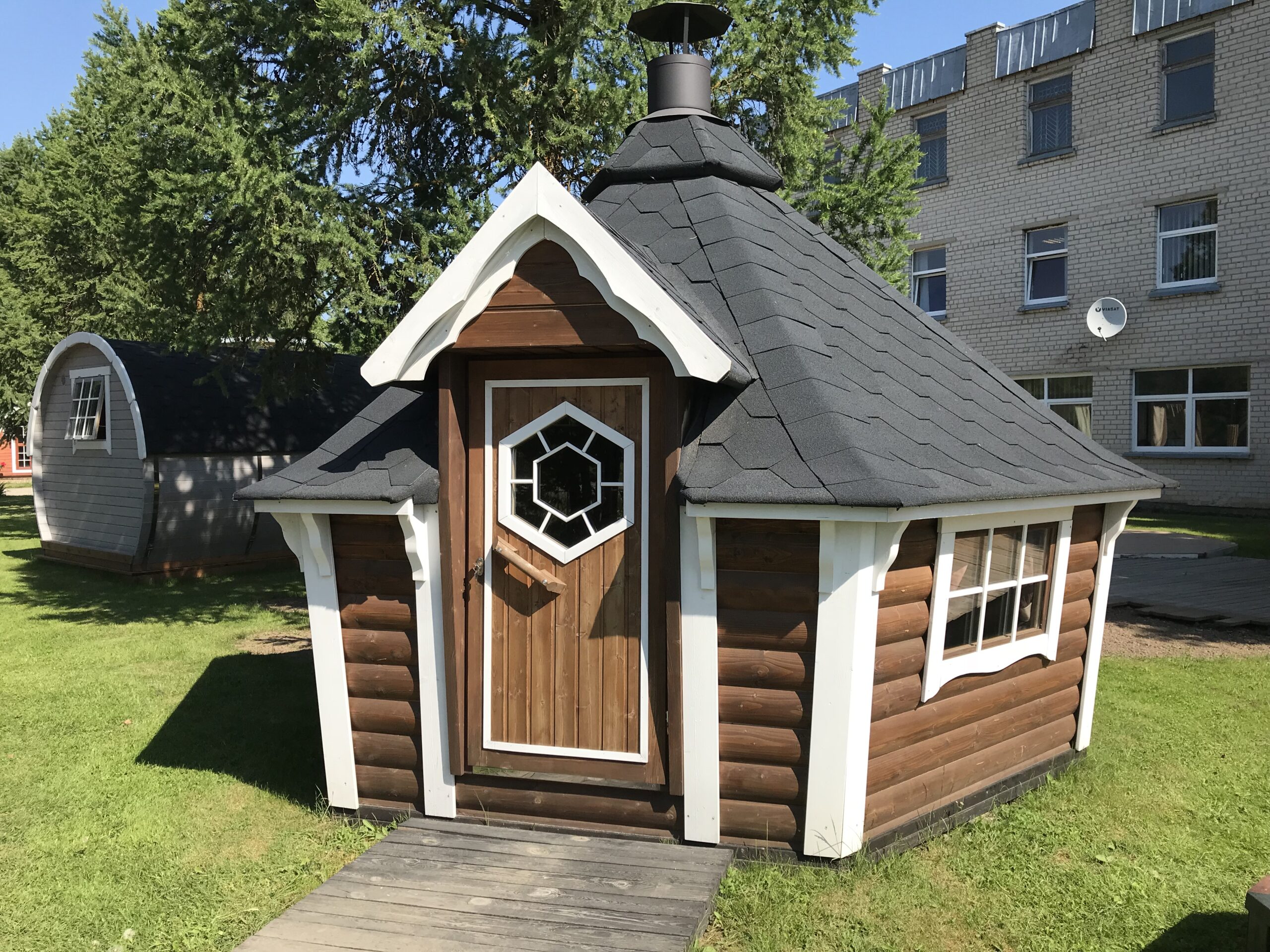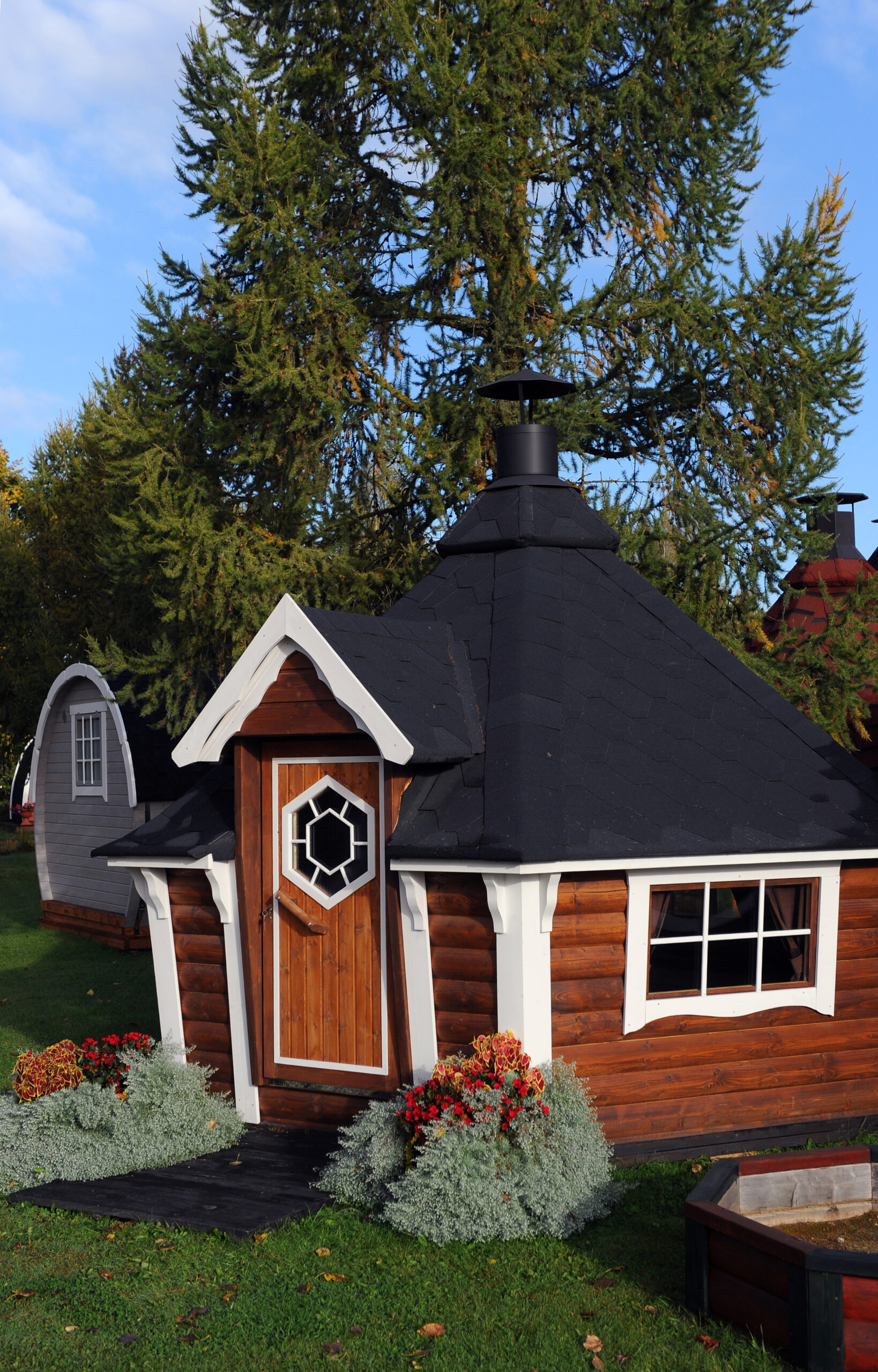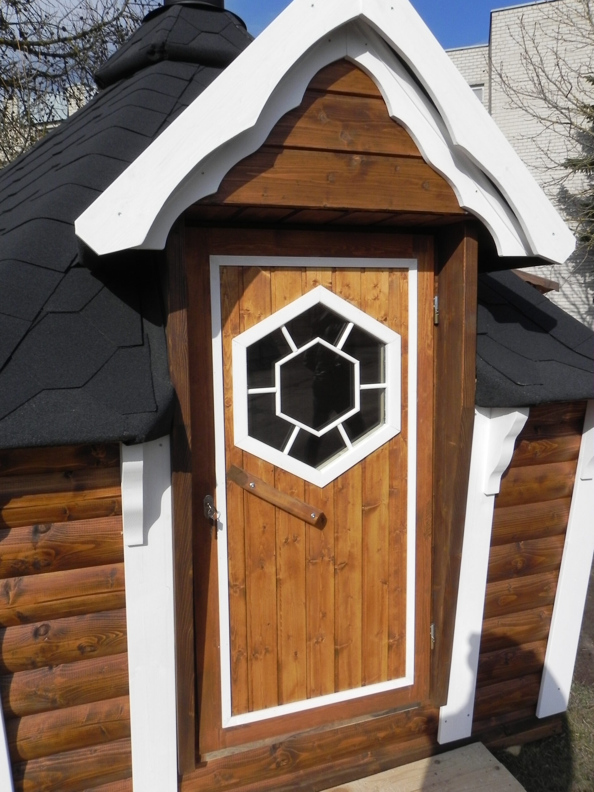 Drei doppelt verglaste Fenster sorgen für eine helle und freundliche Atmosphäre in der Hütte – eines davon lässt sich öffnen, um für frische Luft zu sorgen. Die Tür ist mit einem originellen sechseckigen Fenster verziert und verfügt über ein Schloss, sodass die Hütte sicher verschlossen werden kann.