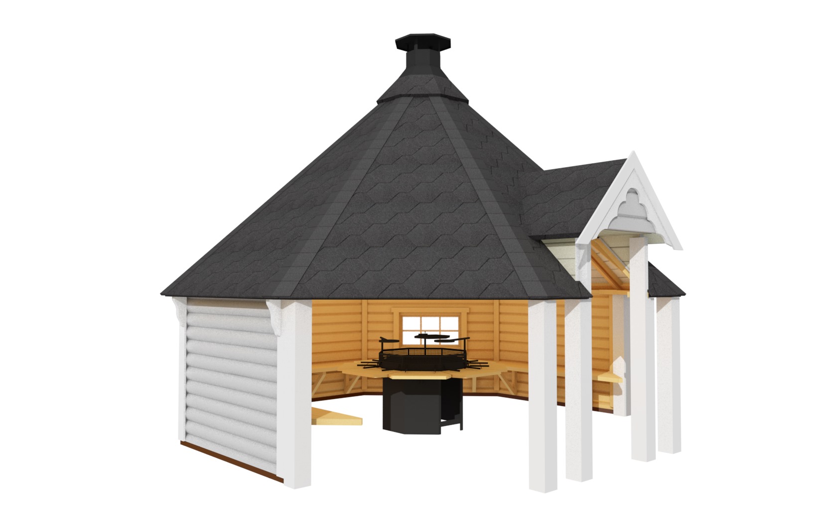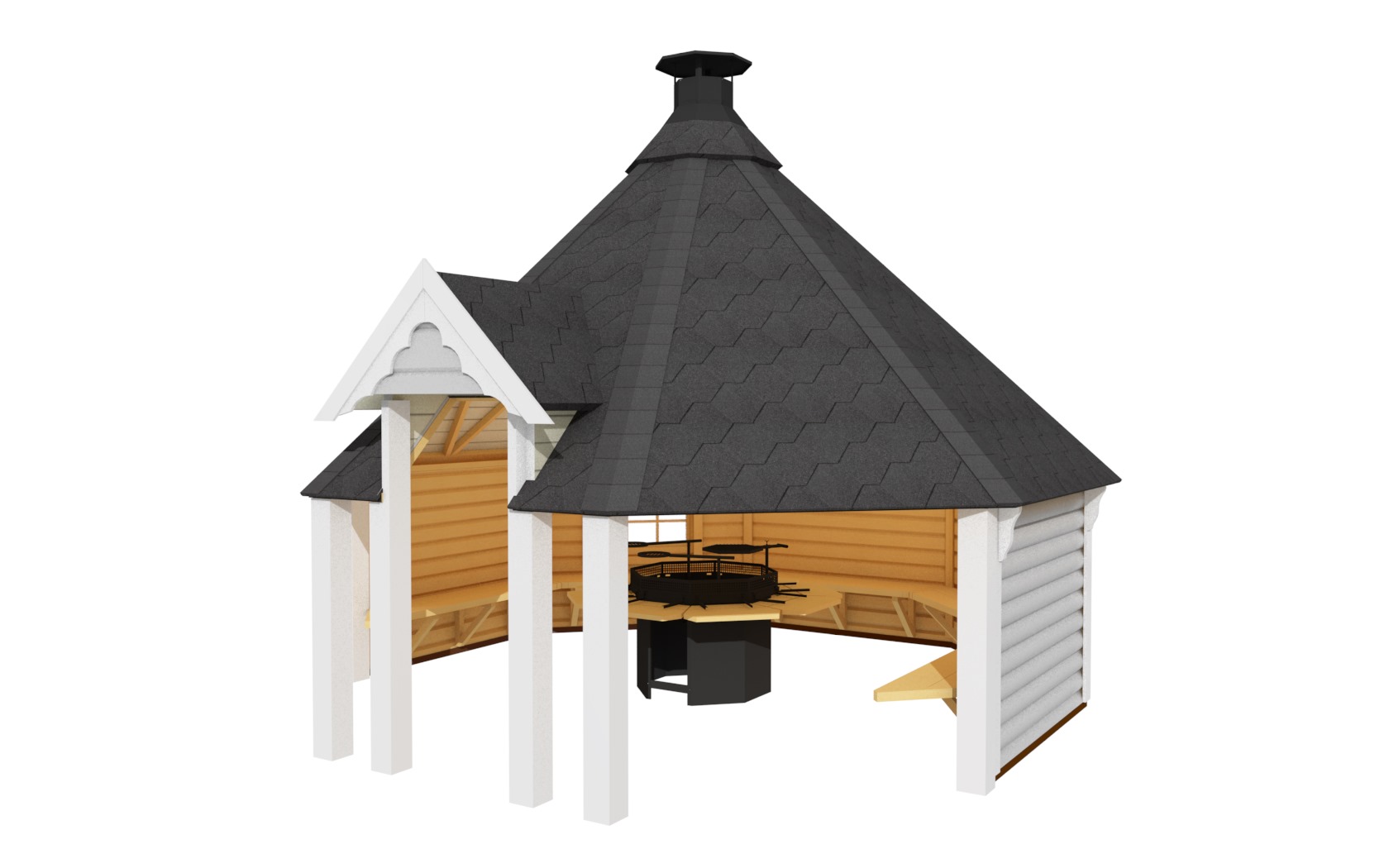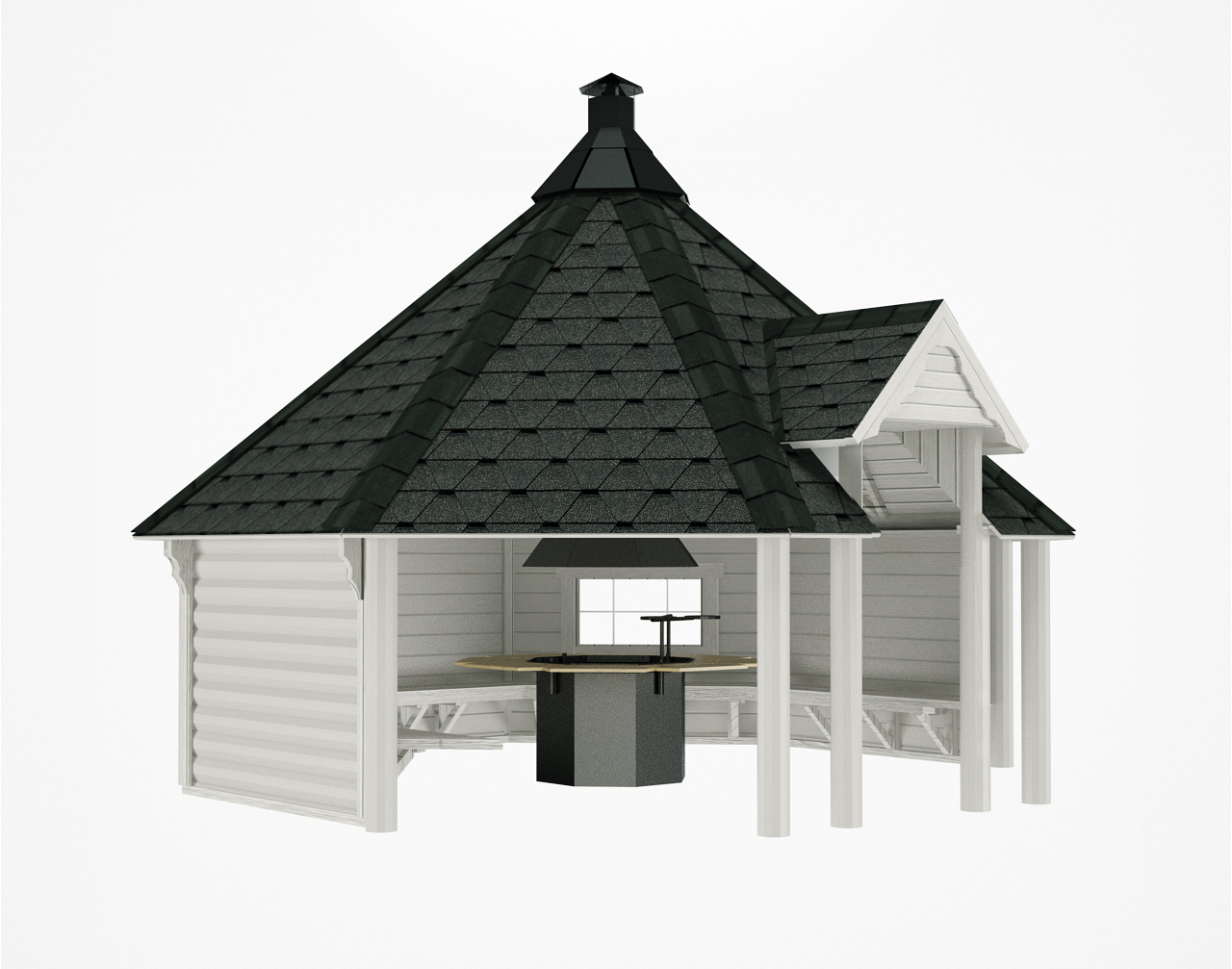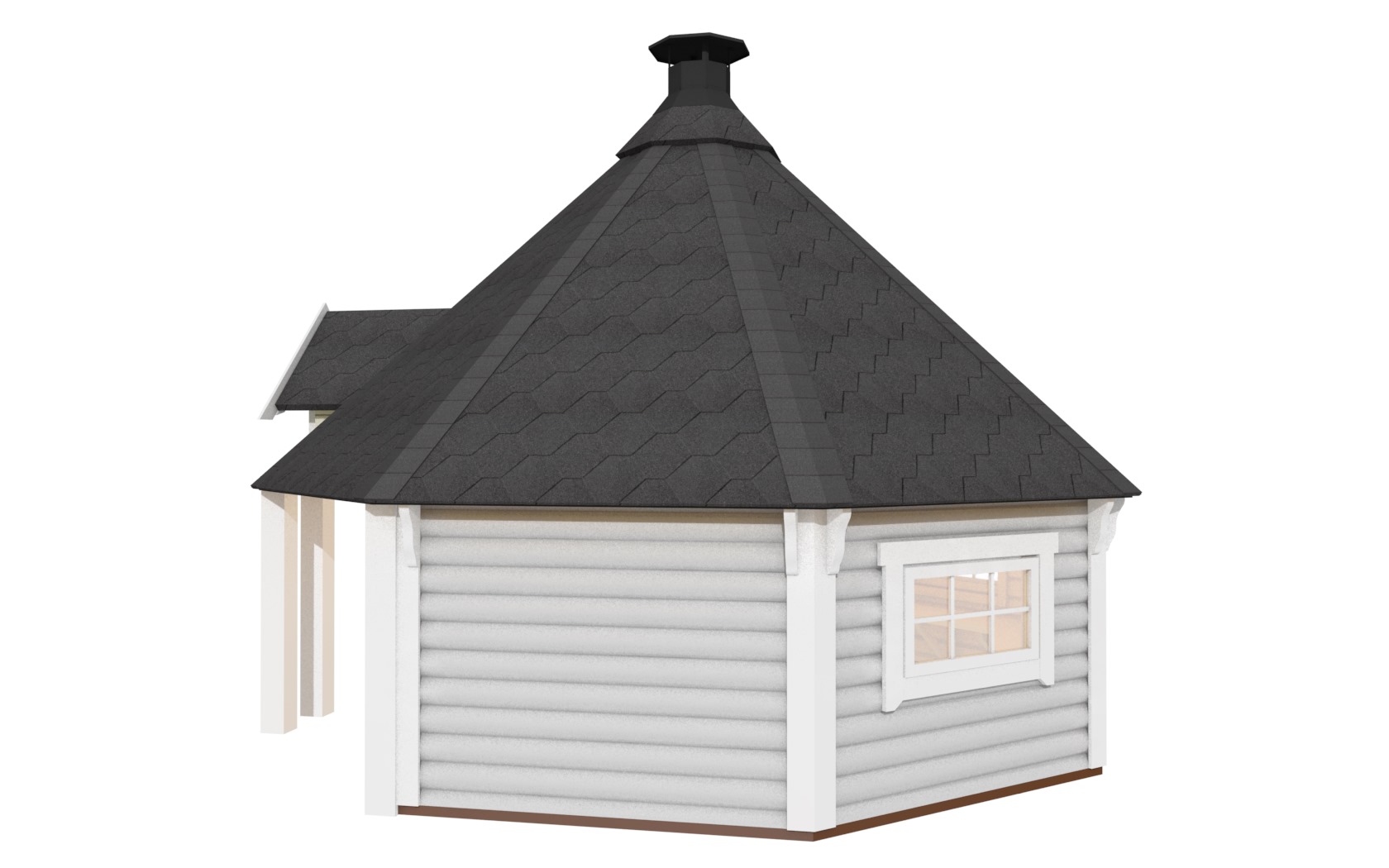 - Achteckiges Dach mit Bitumenschindeln in wählbaren Farben (Rot, Grün oder Schwarz)