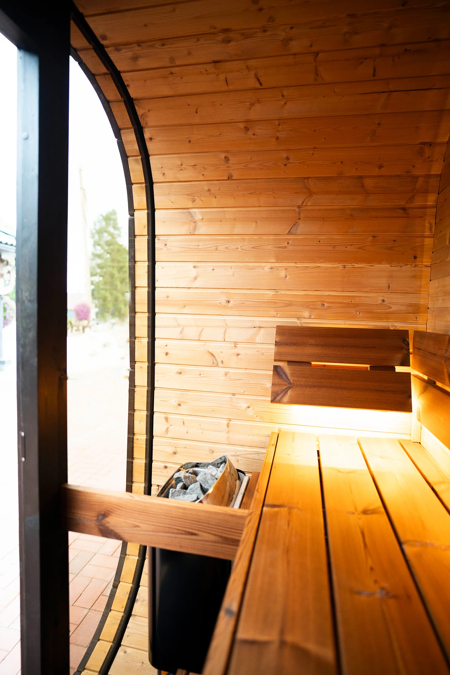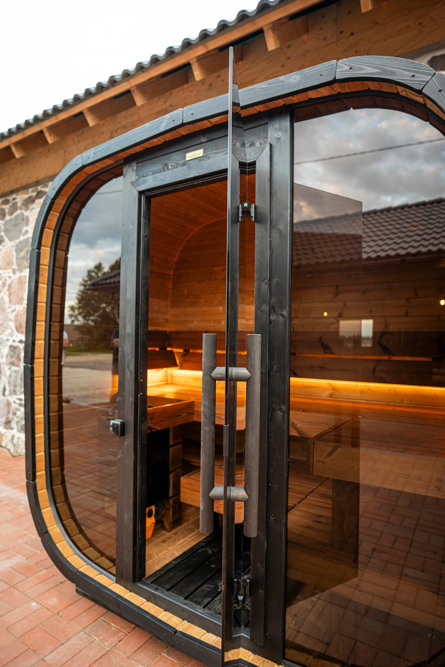 - Panorama-Glasfront: Eine voll verglaste Vorderseite und Tür öffnen den Blick nach draußen und verbinden Sie mit der Natur – für ein Gefühl von Weite und absoluter Entspannung bei jedem Saunagang.