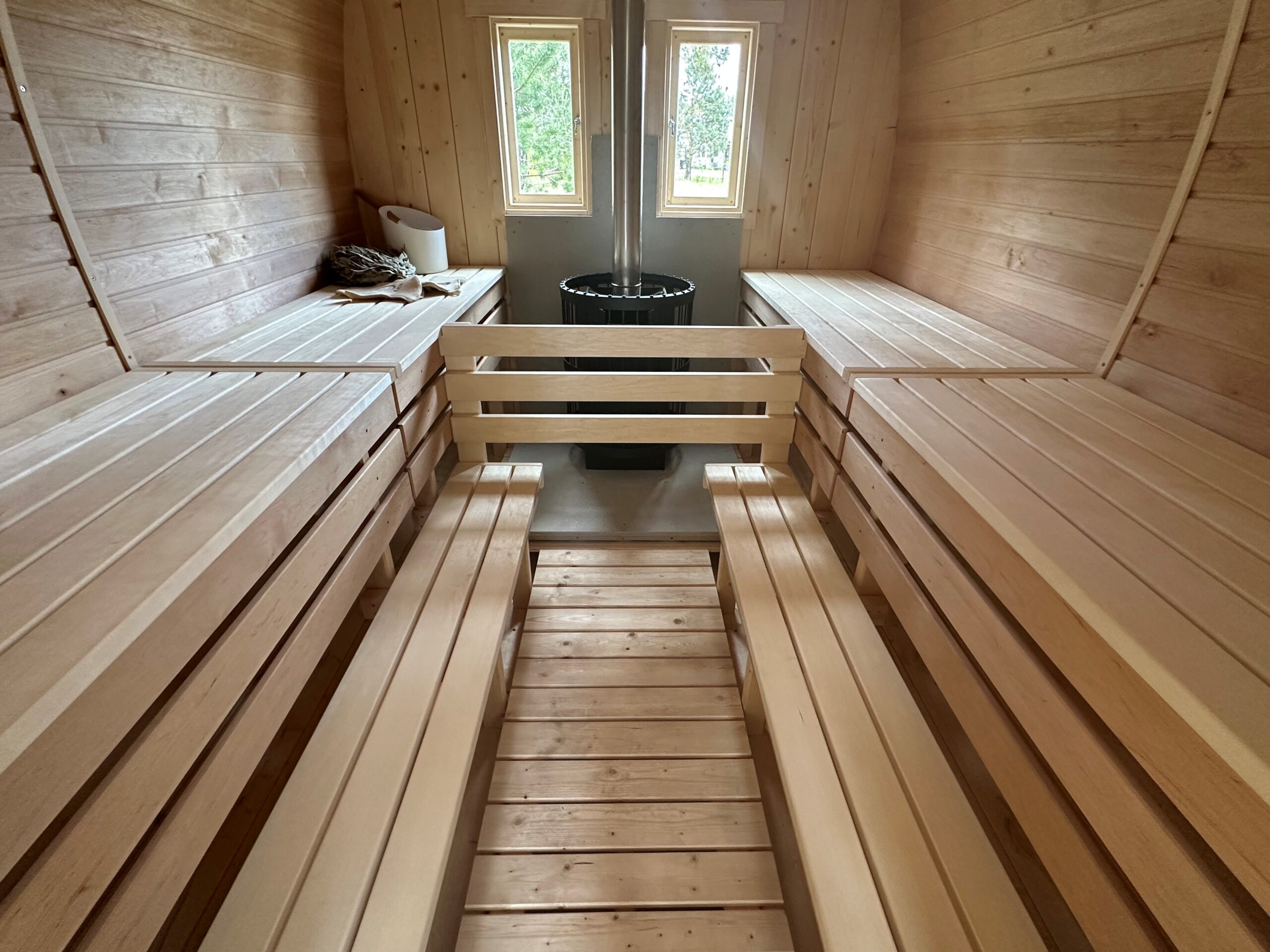 - Hitzebeständige Platten für den Betrieb mit einem Holzofen oder einer Elektroheizung (je nach Wahl).