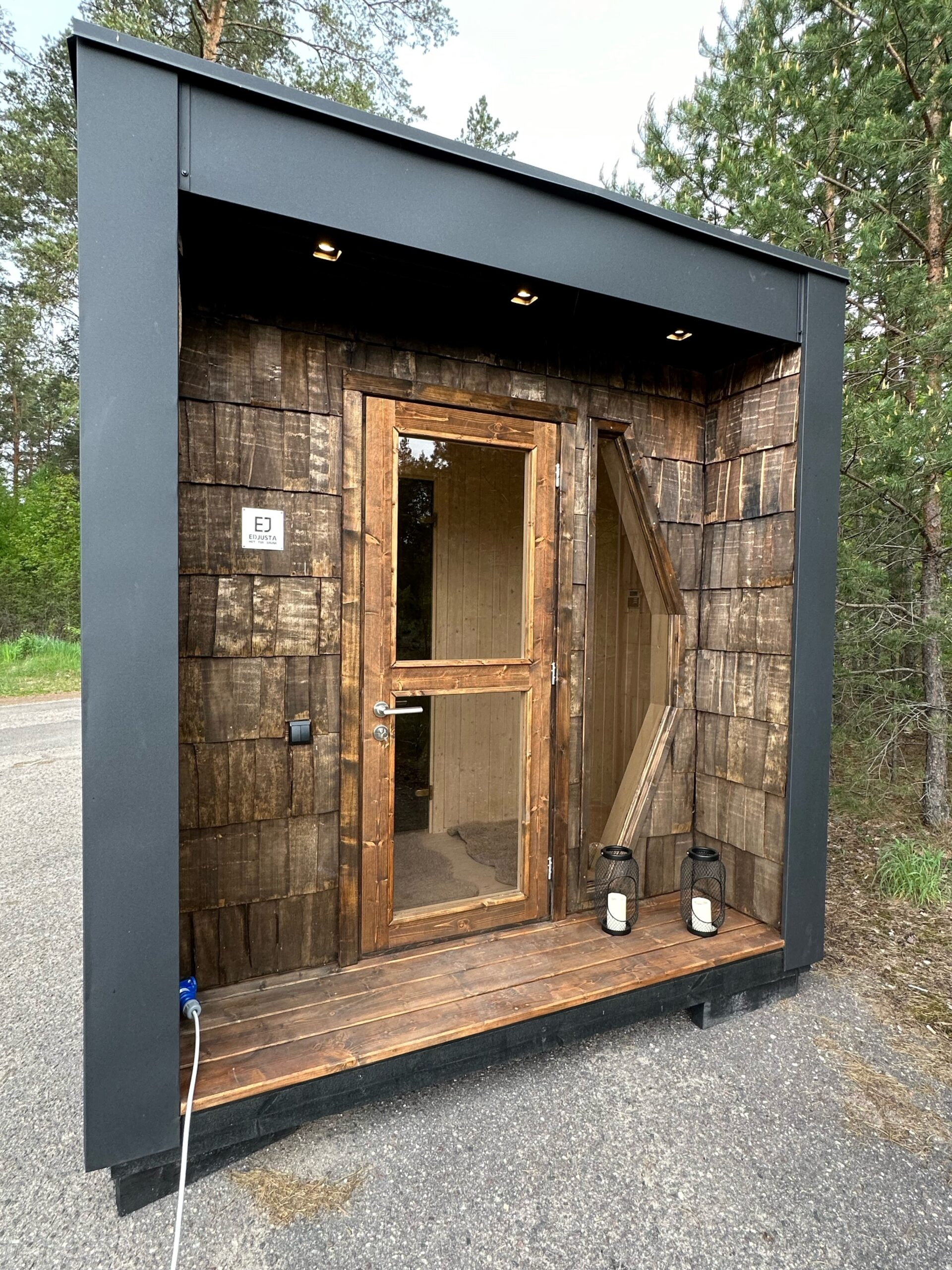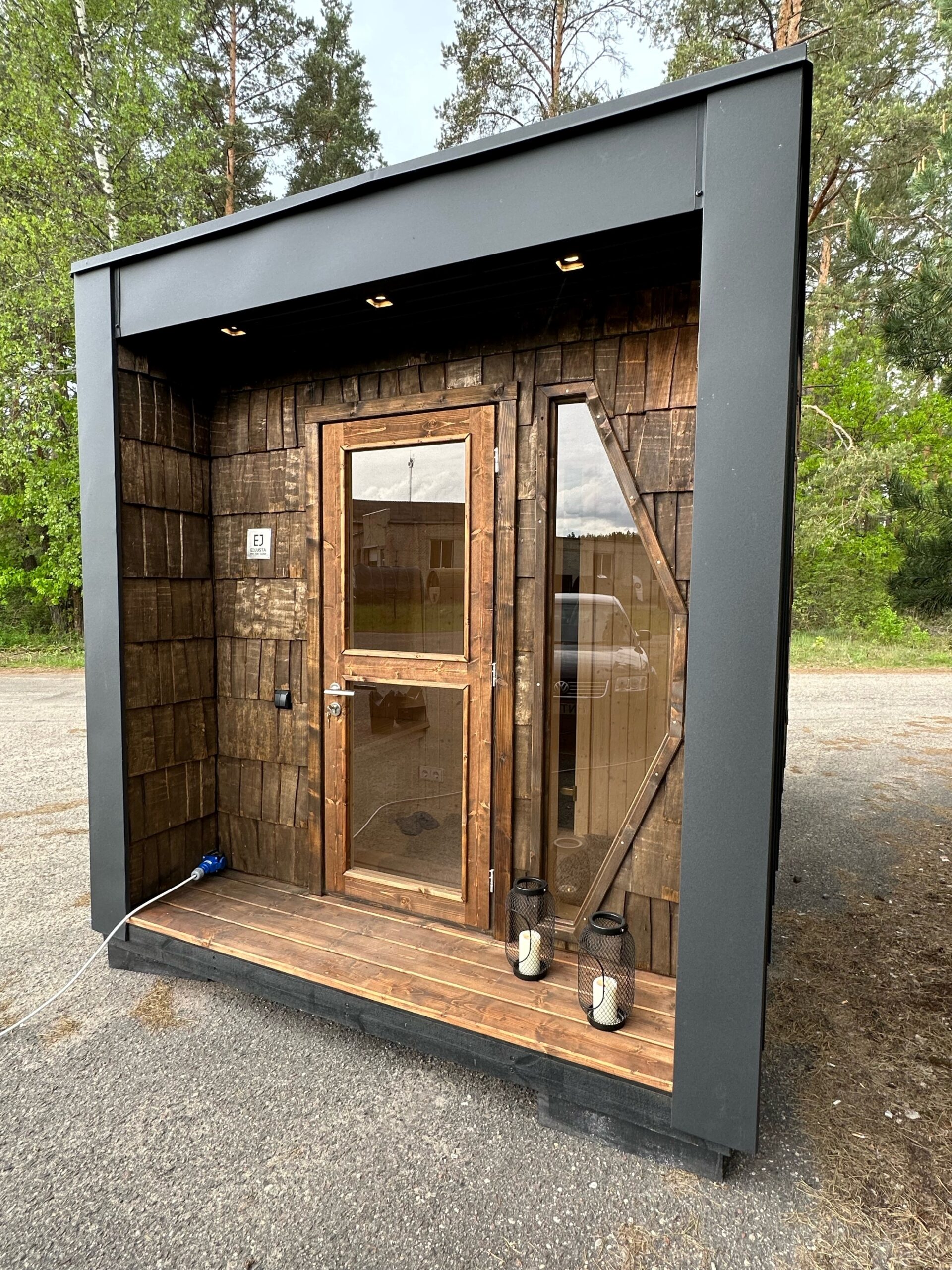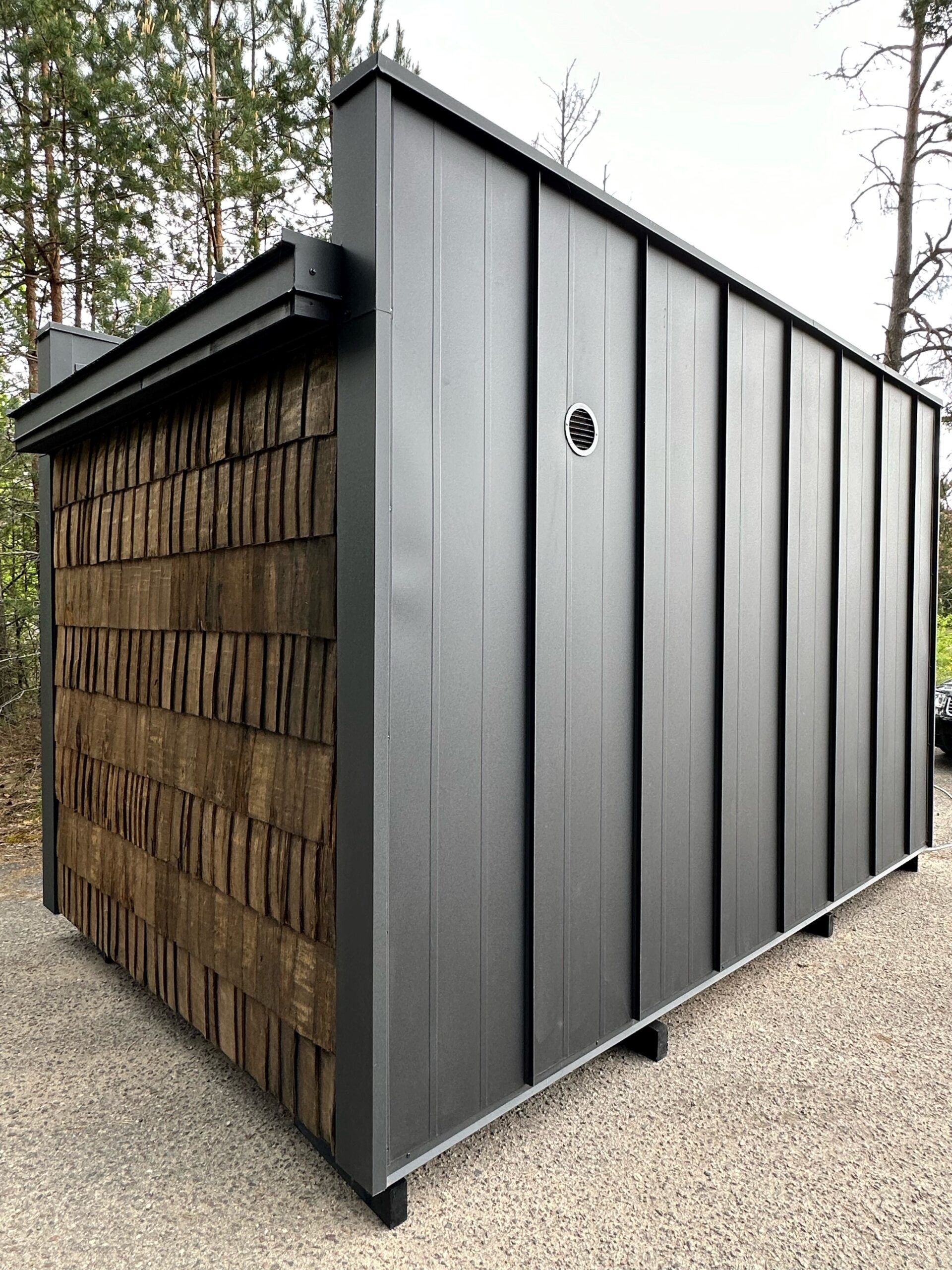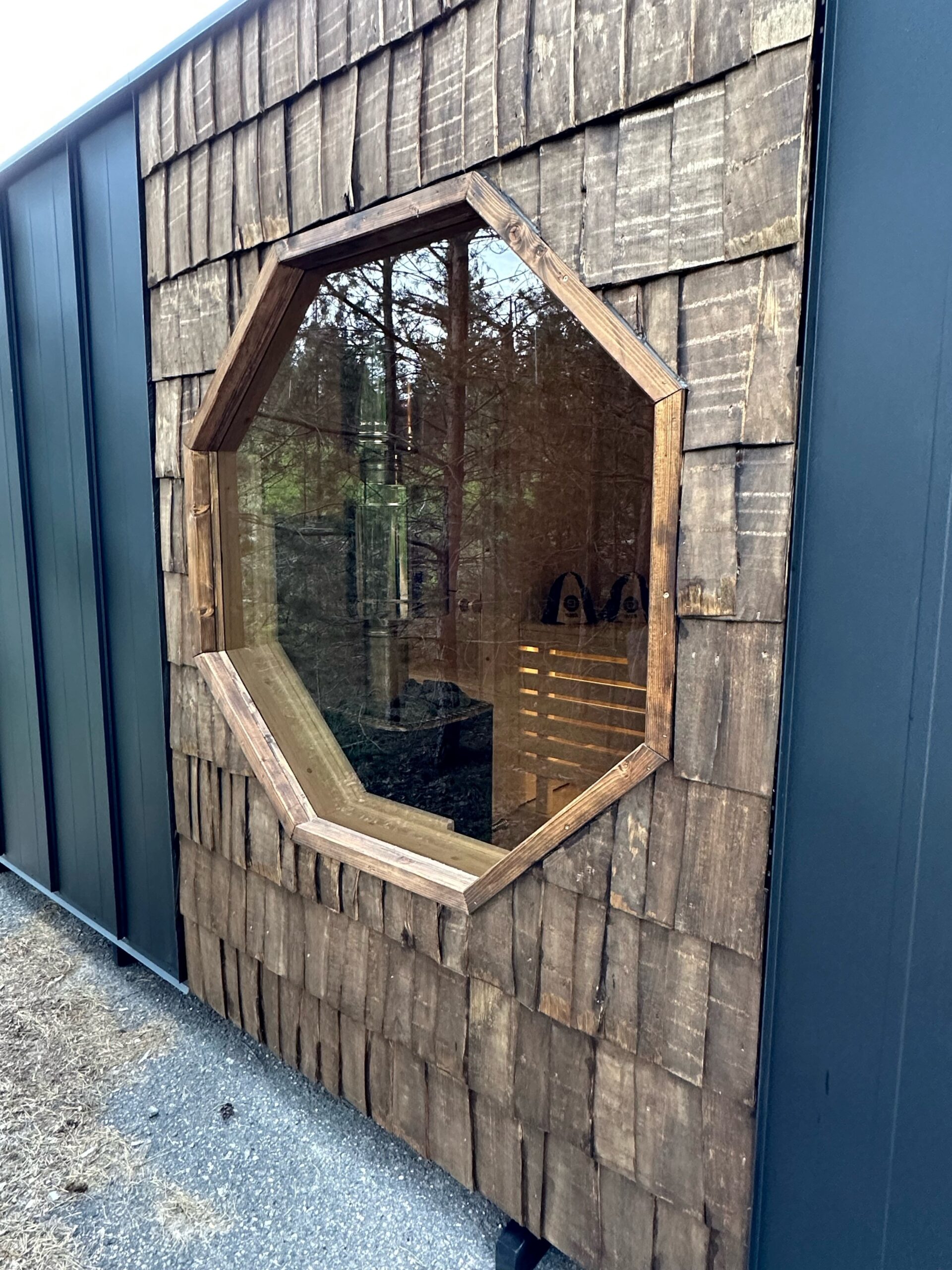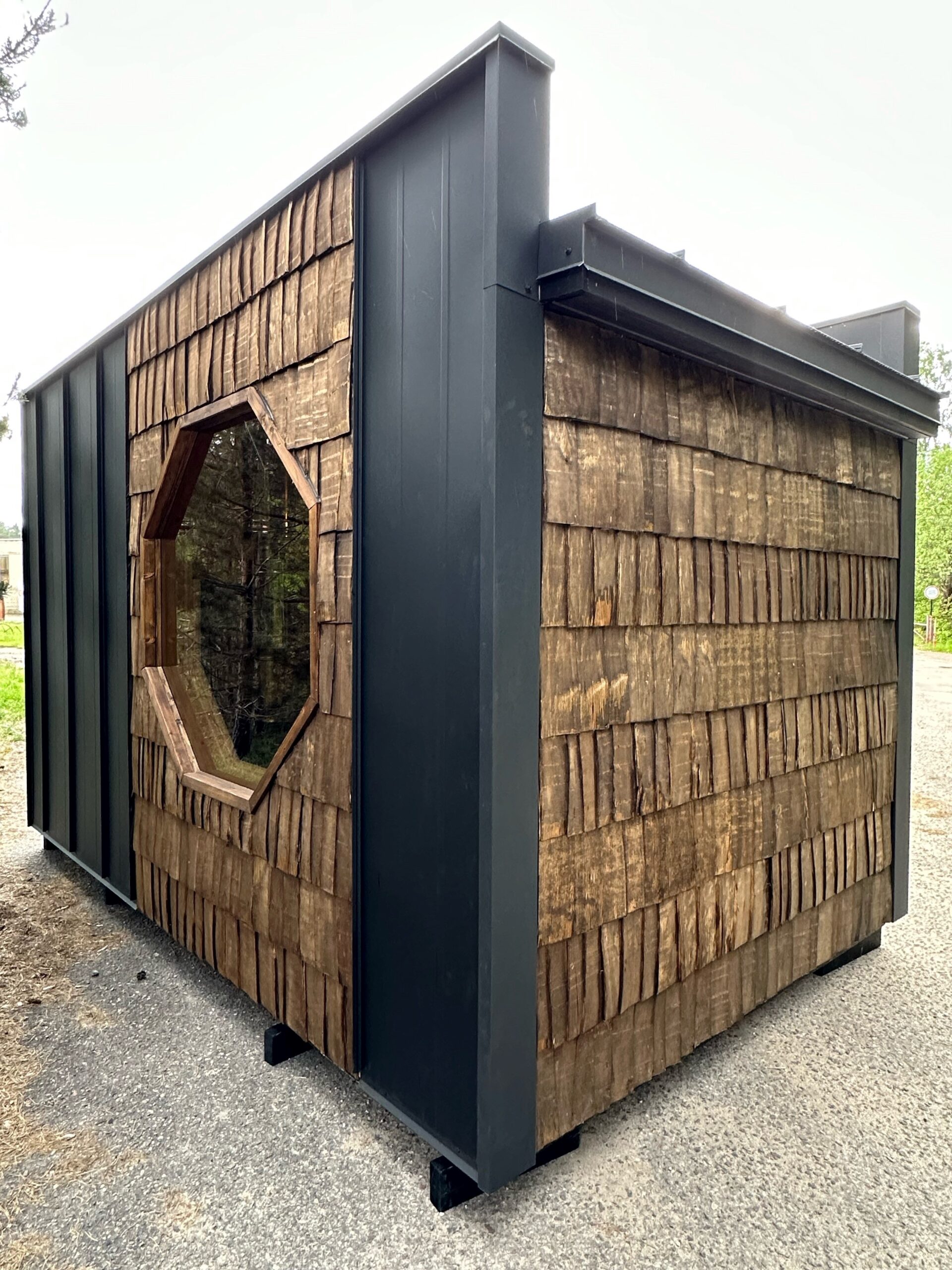 Das „Mini Moderno“ fällt sofort durch sein zeitloses und zugleich modernes Design auf. Die clevere Kombination aus robustem „Classic“-Blech (0,6 mm dick, mit langlebiger 50 µm Polymerbeschichtung) und natürlichen Holzschindeln verleiht der Sauna eine einzigartige, haptisch ansprechende Fassade. Das markante, sechseckige Seitenfenster aus gehärtetem Glas setzt nicht nur architektonische Akzente, sondern lässt auch viel Tageslicht in den Innenraum und bietet einen charmanten Ausblick. Das Dach mit integriertem Luftspalt sorgt für eine optimale Belüftung und Langlebigkeit.
