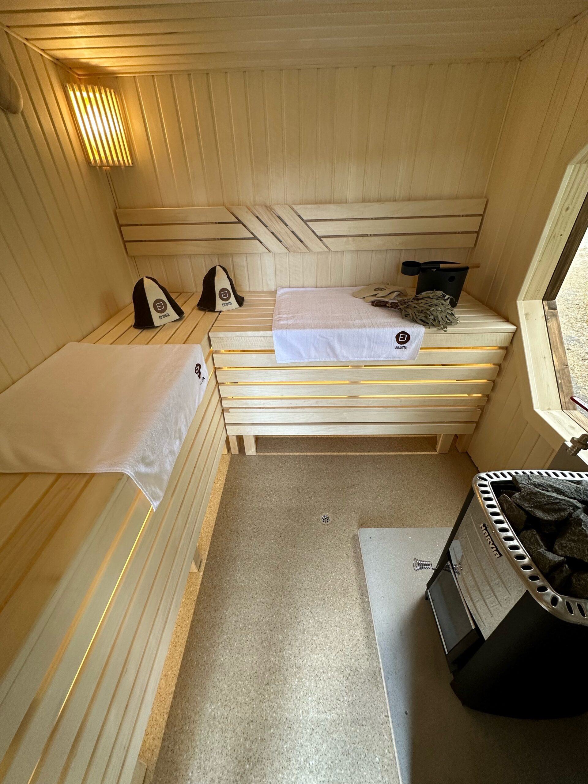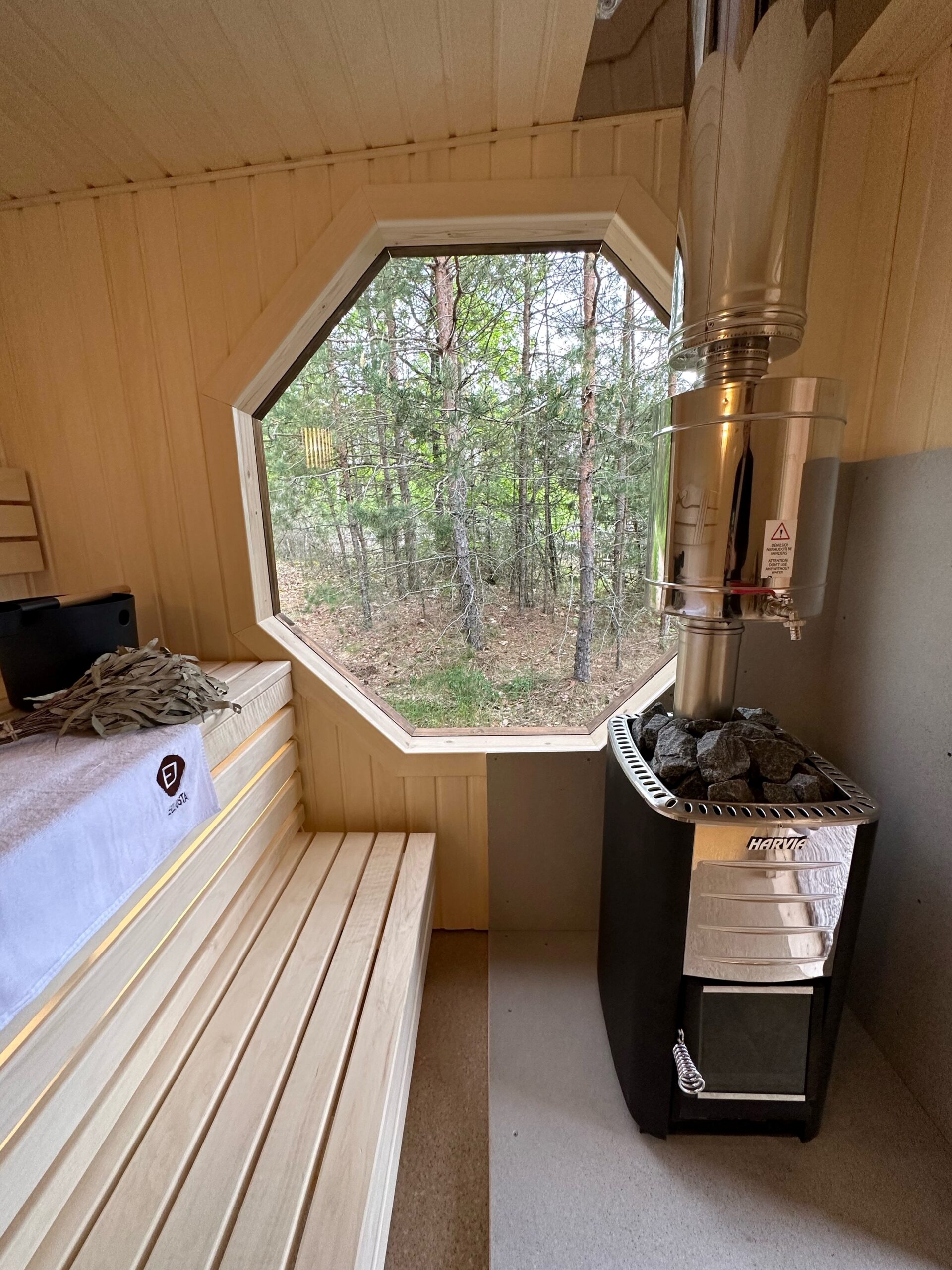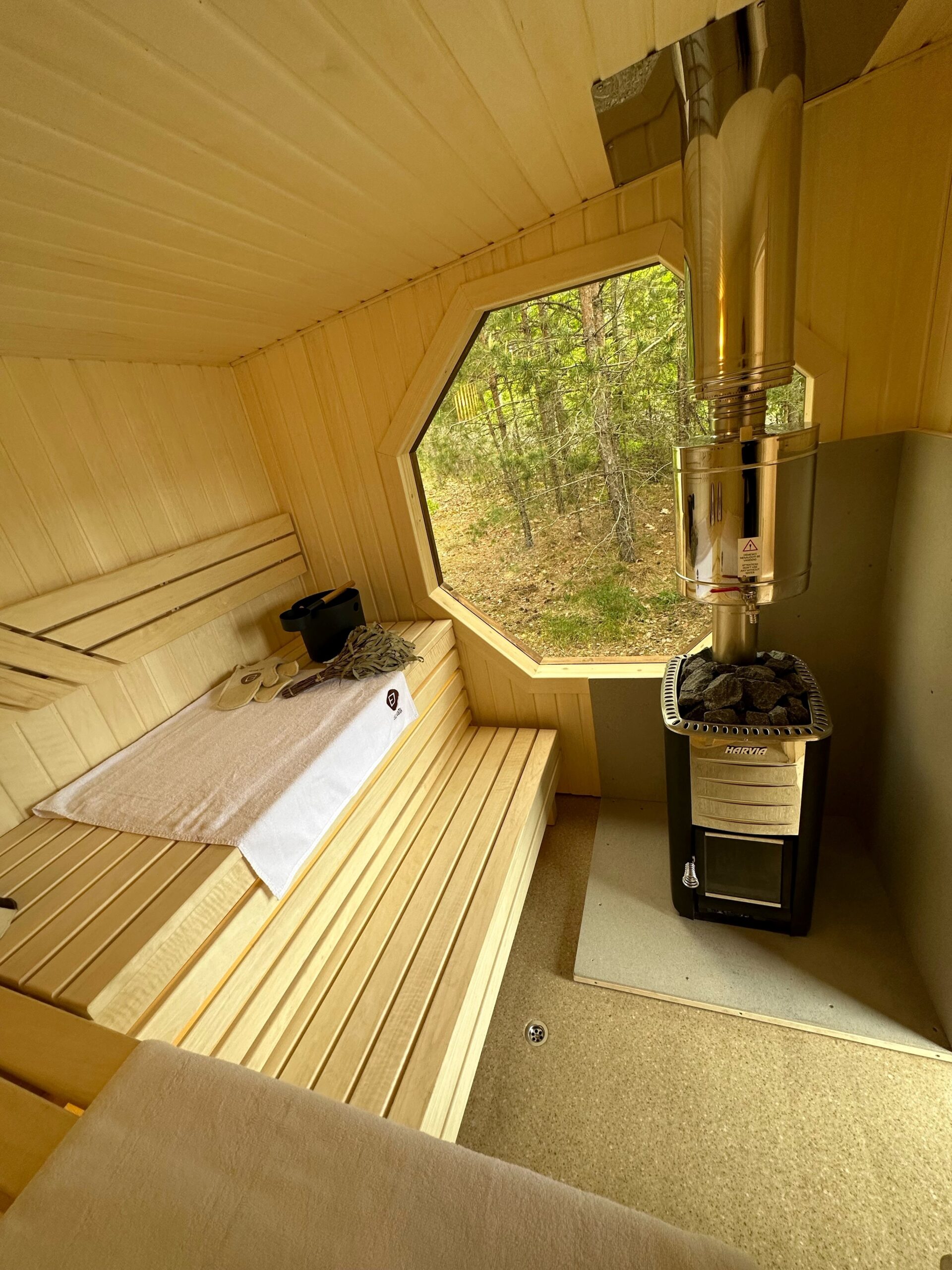 Für das authentische Saunaerlebnis sorgt der in Finnland hergestellte Holzofen „Harvia M3“. Dieser Hochleistungsofen zeichnet sich durch schnelle Aufheizzeiten und eine effiziente Luftzirkulation aus. Die Olivin-Diabas-Steinen speichern die Hitze optimal und geben bei Aufguss einen weichen, wohligen Dampf ab. Der am Schornstein angebrachte 22-Liter-Edelstahl-Wassertank sorgt für stets heißes Wasser. Ihre Sicherheit wird durch hitzebeständige „Cembrit“-Schutzplatten rund um den Ofen gewährleistet. Für ein angenehmes Klima sorgen zwei Lüftungsdiffusoren, die einen steten Frischluftstrom ermöglichen. Ein praktisches Wasserablaufloch erleichtert die Reinigung und Pflege der Kabine.