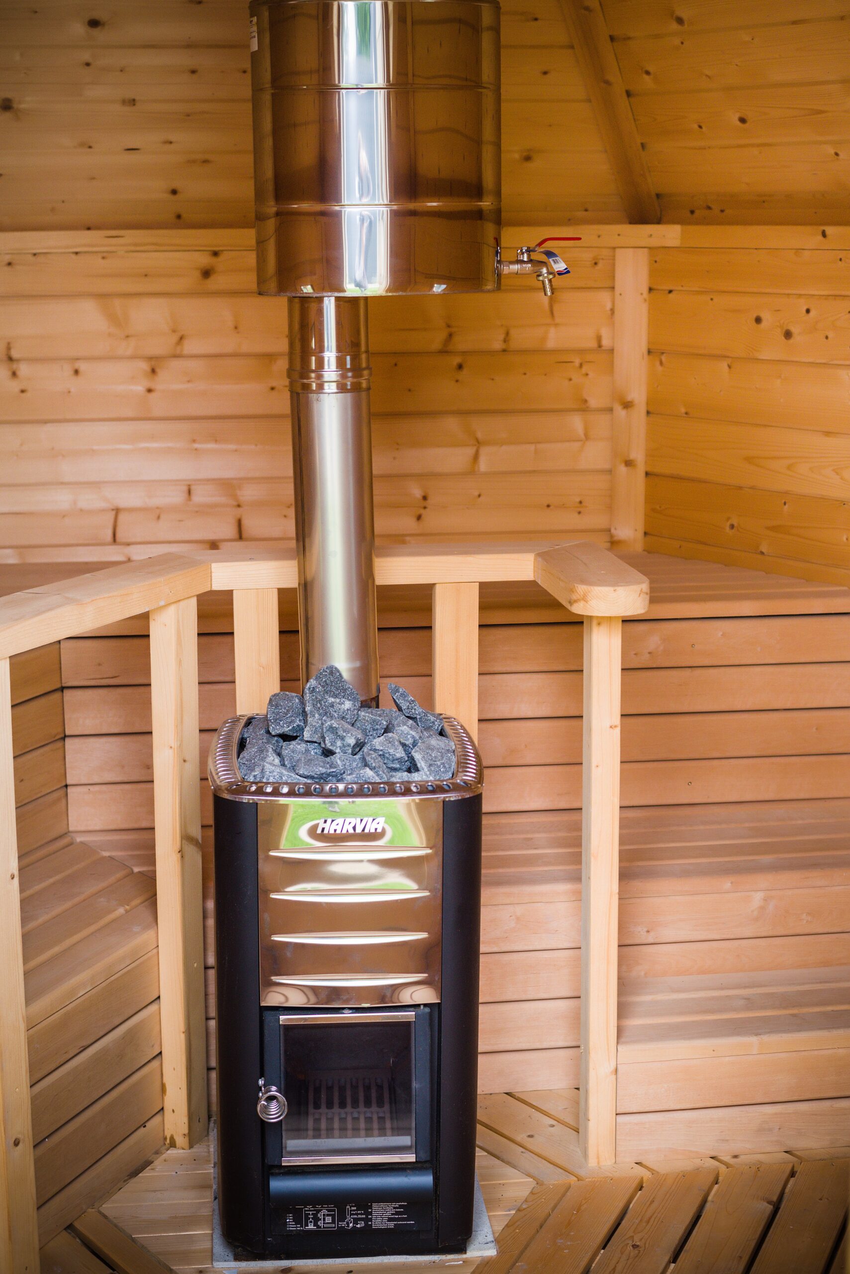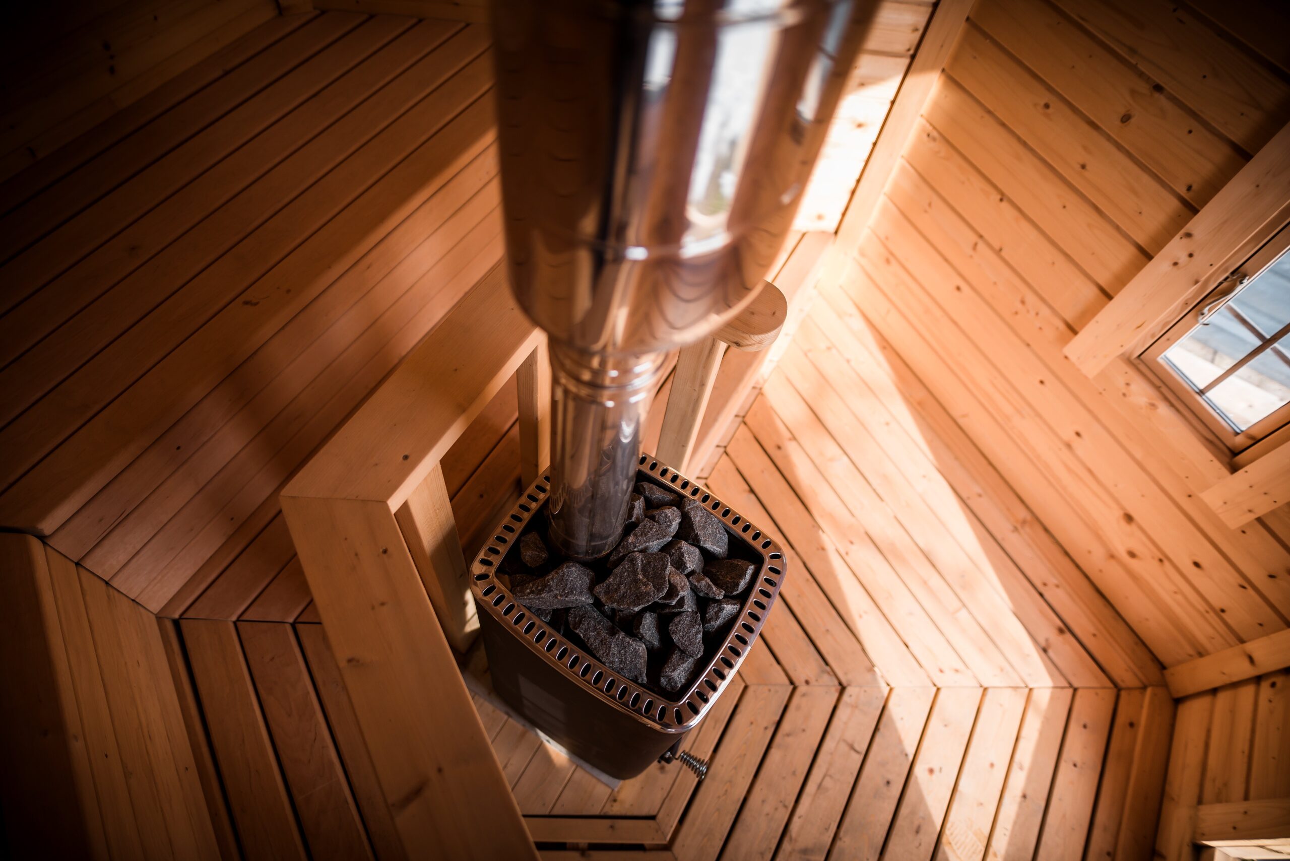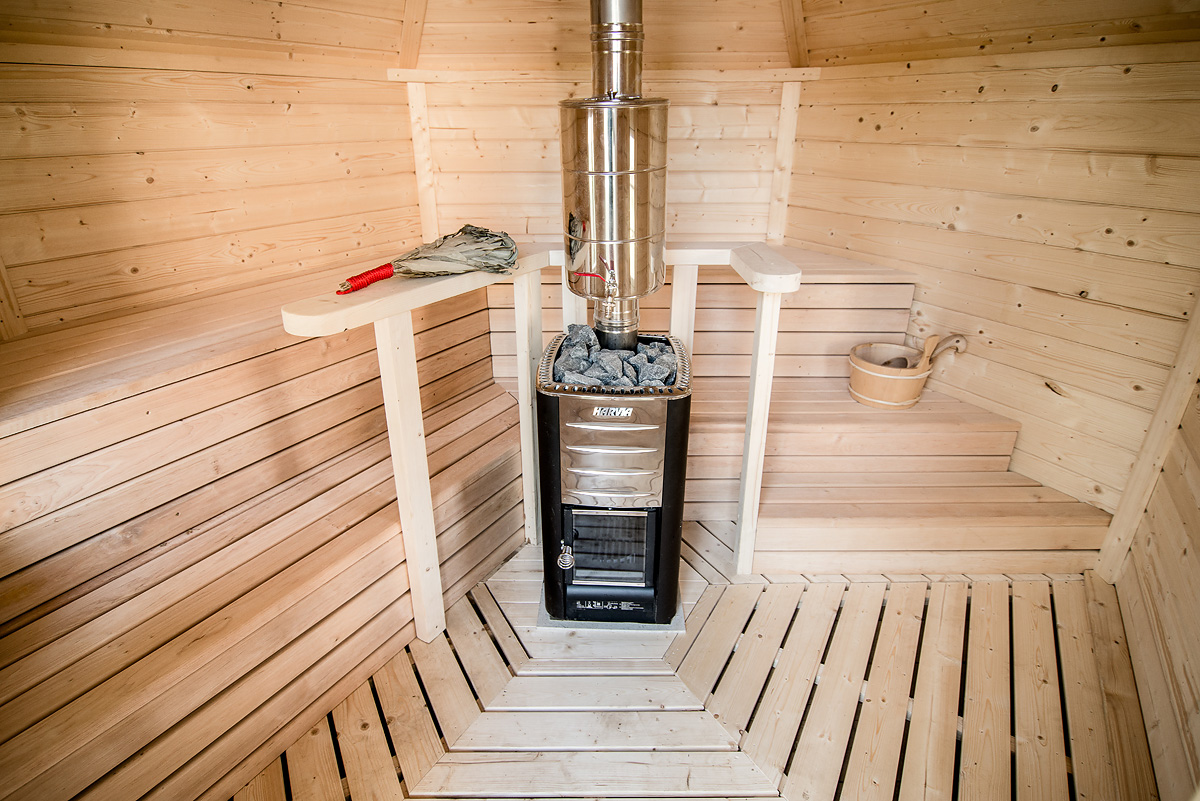 Im Inneren erwartet Sie ein wohnlich gestalteter Saunabereich mit zweistufigen, breiten Saunabänken aus strapazierfähigem Laubholz, die entlang von drei Wänden verlaufen. Dadurch haben alle Nutzer genügend Platz, um sich bequem hinzulegen oder zu sitzen. In der Mitte wird ein Elektro- oder Holzofen positioniert, der für angenehme Temperaturen sorgt.