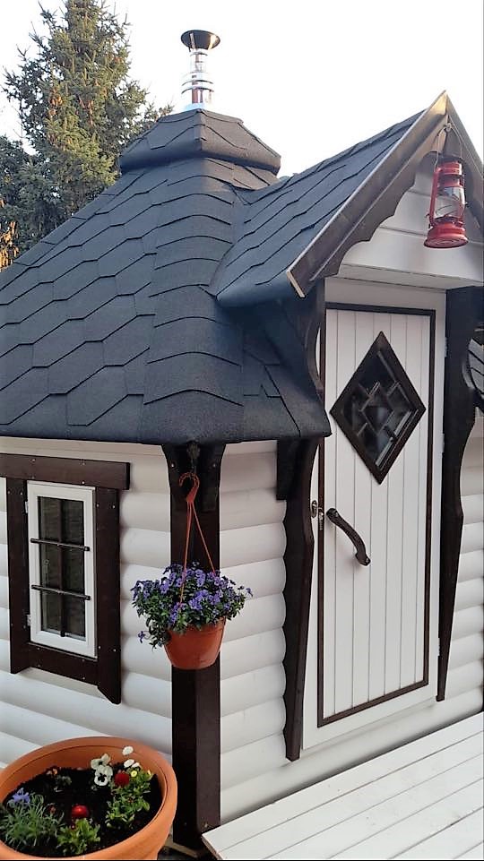 Die Saunakota TAIGA 7 besteht aus hochwertigem Fichtenholz, das für seine exzellente Wärmedämmung und angenehme Haptik bekannt ist. Die sechs Wände und das Dach sind sorgfältig verarbeitet, um eine optimale Wärmeisolierung zu gewährleisten. Zwei der Wände sind mit rechteckigen Doppelglasfenstern ausgestattet, die natürliches Licht einlassen und gleichzeitig eine gemütliche Atmosphäre schaffen. Die isolierte Dacheindeckung mit Bitumenschindeln in Ihrer Wunschfarbe sorgt für Wetterbeständigkeit und ein harmonisches Gesamtbild.