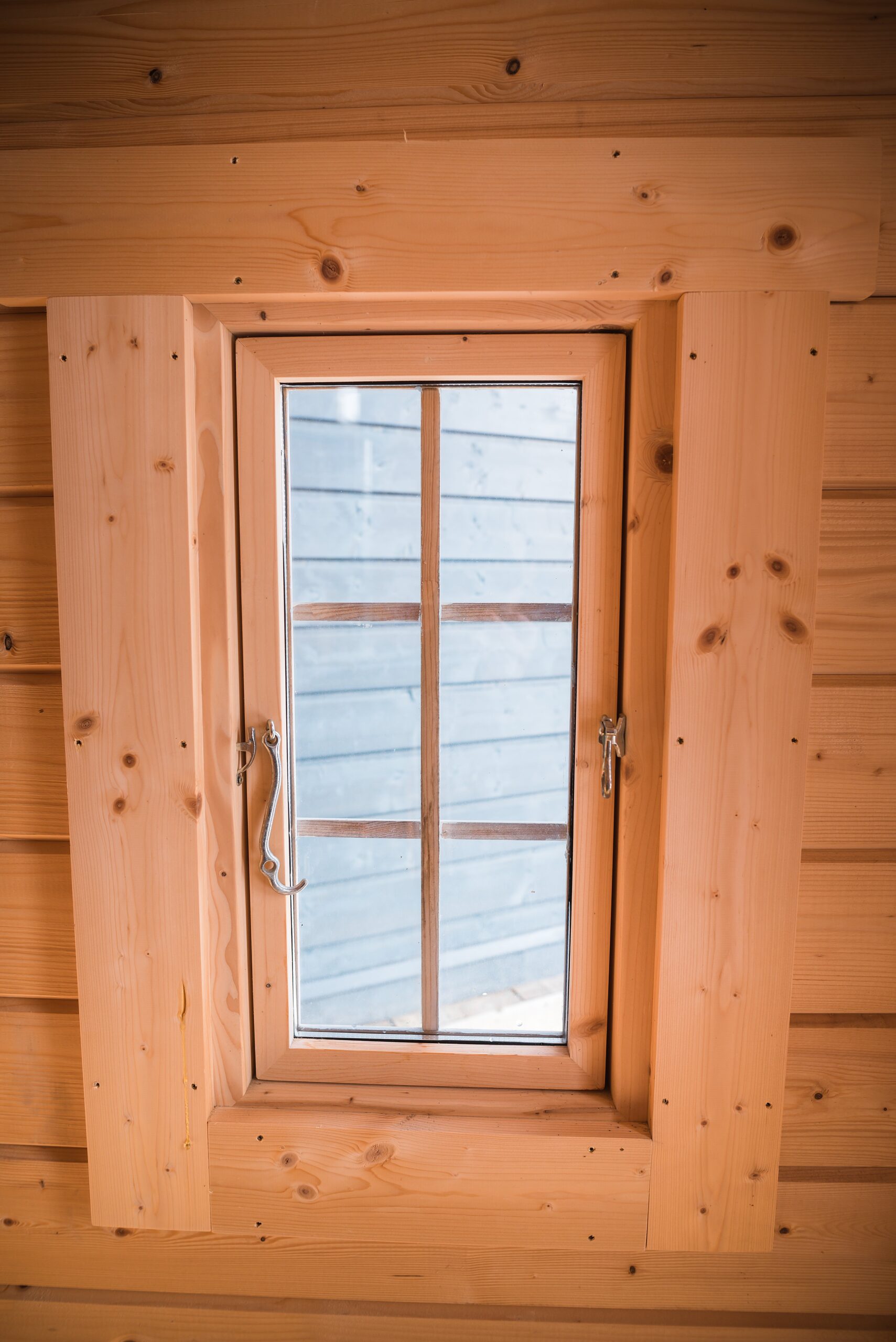 Die massive Holztür mit Schloss und quadratischem Fenster macht die Sauna nicht nur absperrbar, sondern unterstreicht auch das harmonische Design.