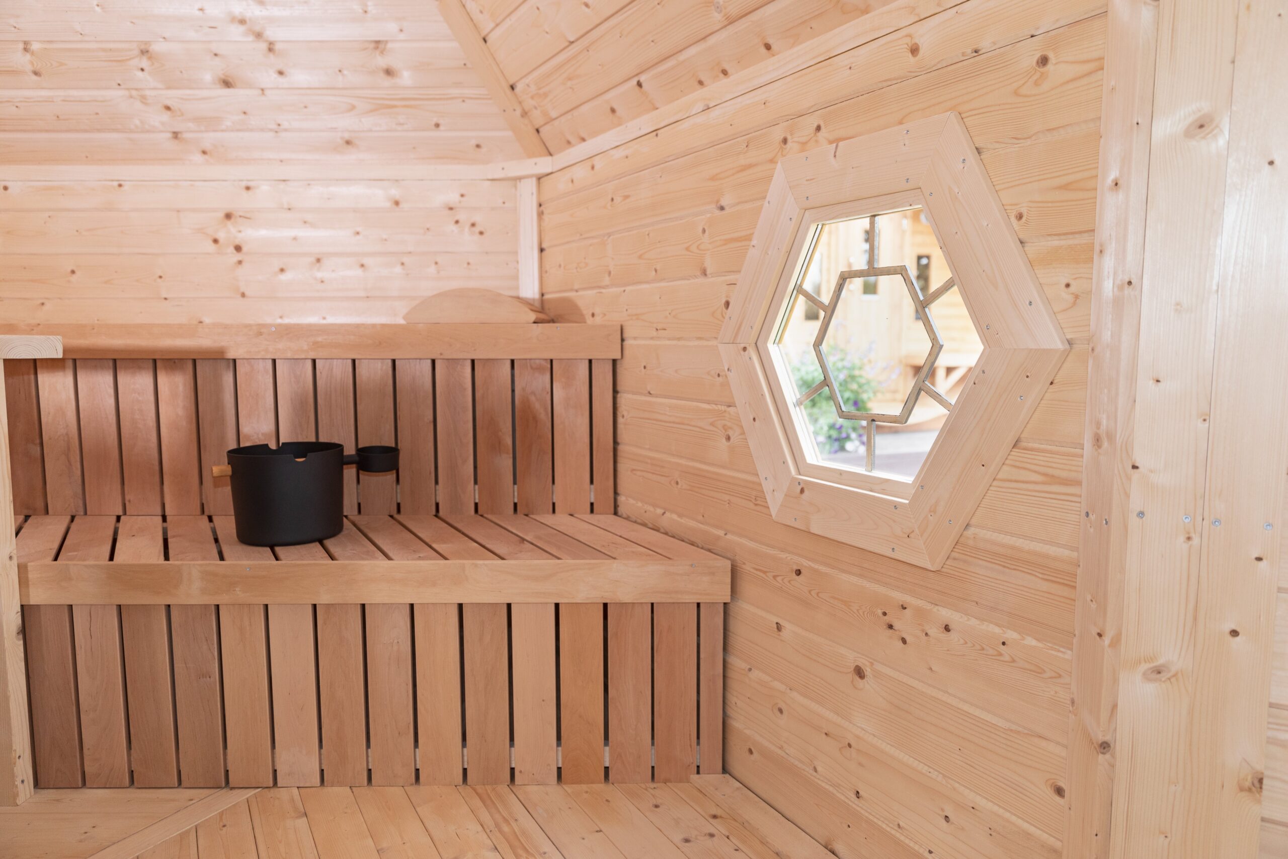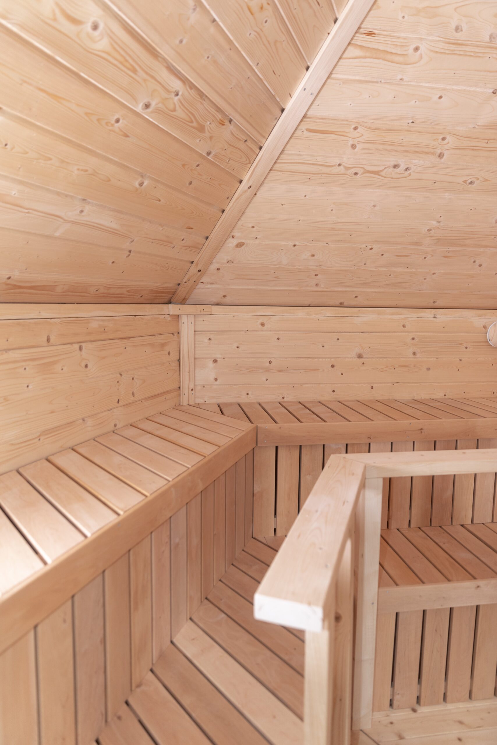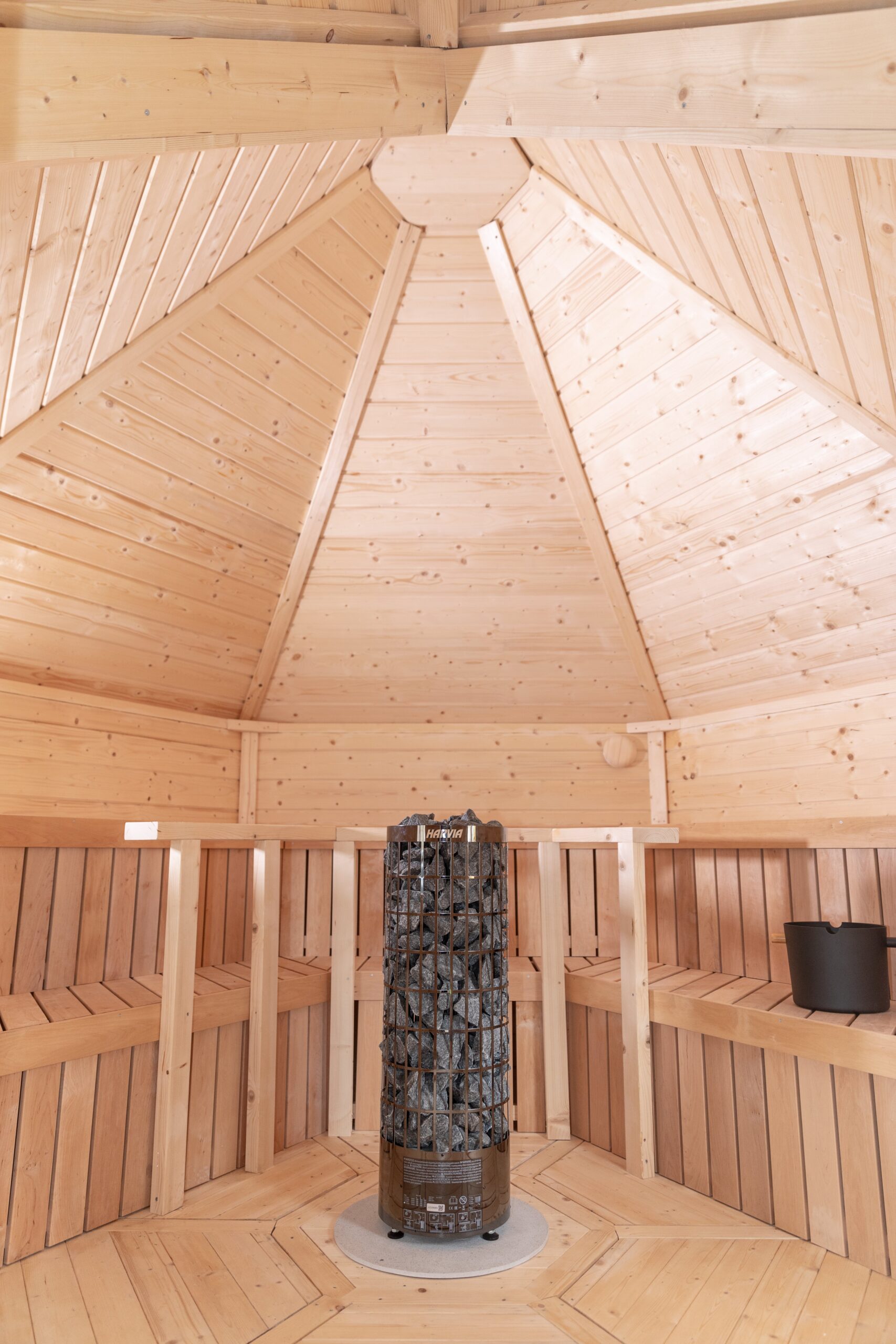 Im Inneren erwartet Sie ein wohnlich gestalteter Saunabereich mit zweistufigen, breiten Saunabänken aus strapazierfähigem Laubholz, die entlang von drei Wänden verlaufen. Dadurch haben alle Nutzer genügend Platz, um sich bequem hinzulegen oder zu sitzen. In der Mitte wird ein Elektro- oder Holzofen positioniert, der für angenehme Temperaturen sorgt.
