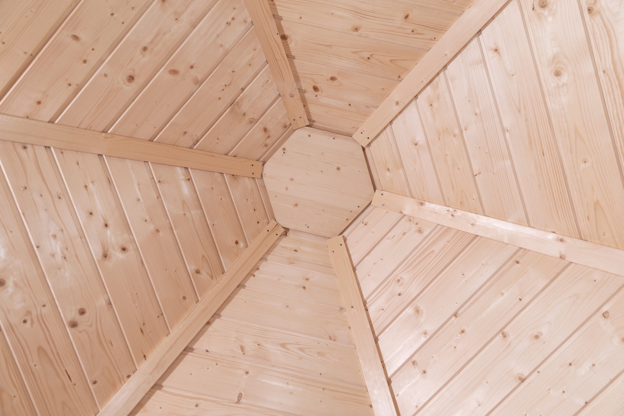 Die Saunakota TAIGA 9 besteht aus hochwertigem Fichtenholz, das für seine exzellente Wärmedämmung und angenehme Haptik bekannt ist. Die sechs Wände und das Dach sind sorgfältig verarbeitet, um eine optimale Wärmeisolierung zu gewährleisten. Zwei der Wände sind mit sechseckigen Doppelglasfenstern ausgestattet, die natürliches Licht einlassen und gleichzeitig eine gemütliche Atmosphäre schaffen. Die isolierte Dacheindeckung mit Bitumenschindeln in Ihrer Wunschfarbe sorgt für Wetterbeständigkeit und ein harmonisches Gesamtbild.